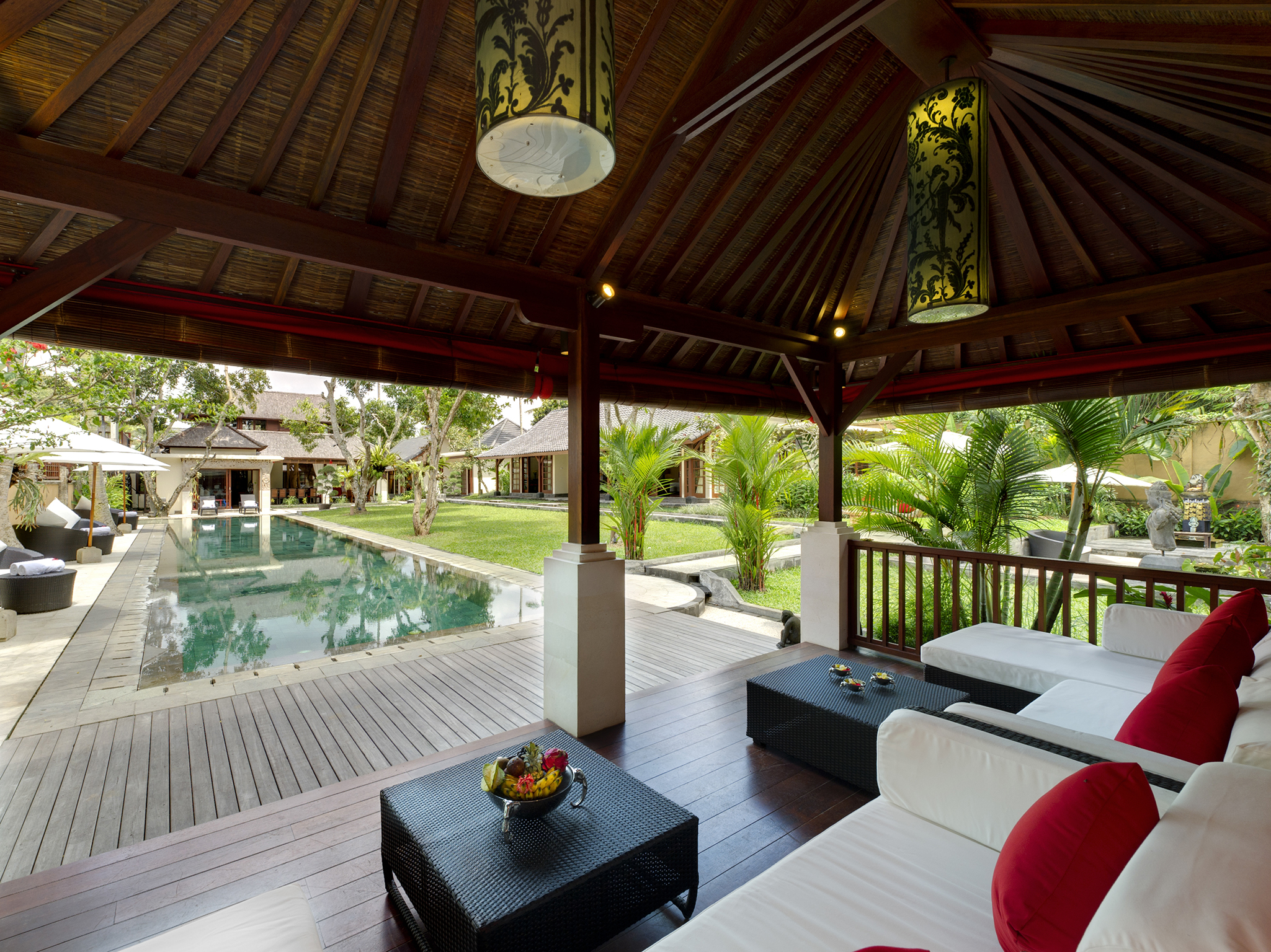 From a driveway off one of Ubud’s bustling streets, a short flight of steps (with a ramp thoughtfully positioned to make this single-storey villa accessible to those with limited mobility) leads to peace, in the shape of the grand wooden gateway into Villa San. From the entrance, a mature garden stretches out past the bedroom and living pavilions, with a 25m-long pool and relaxation