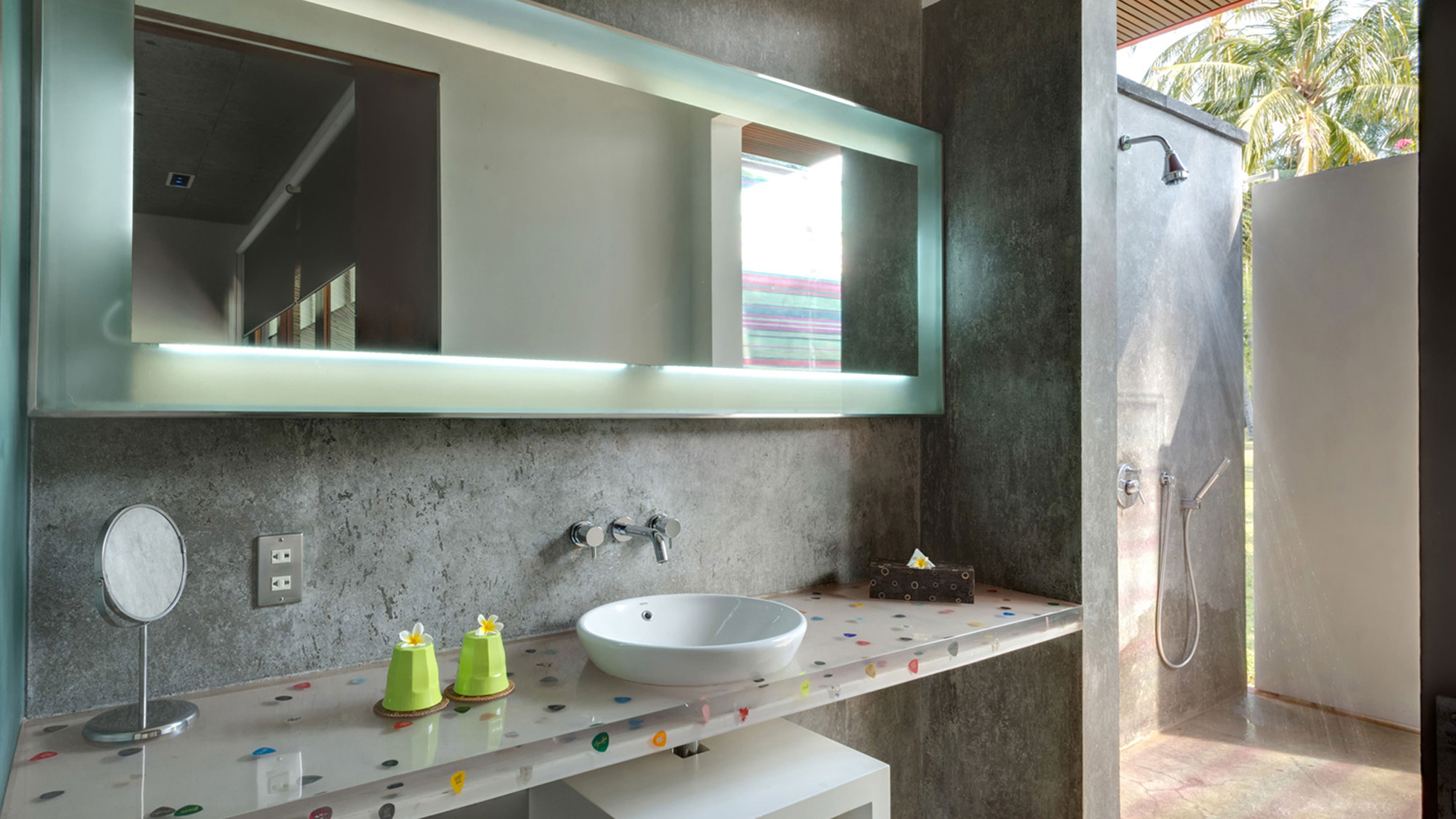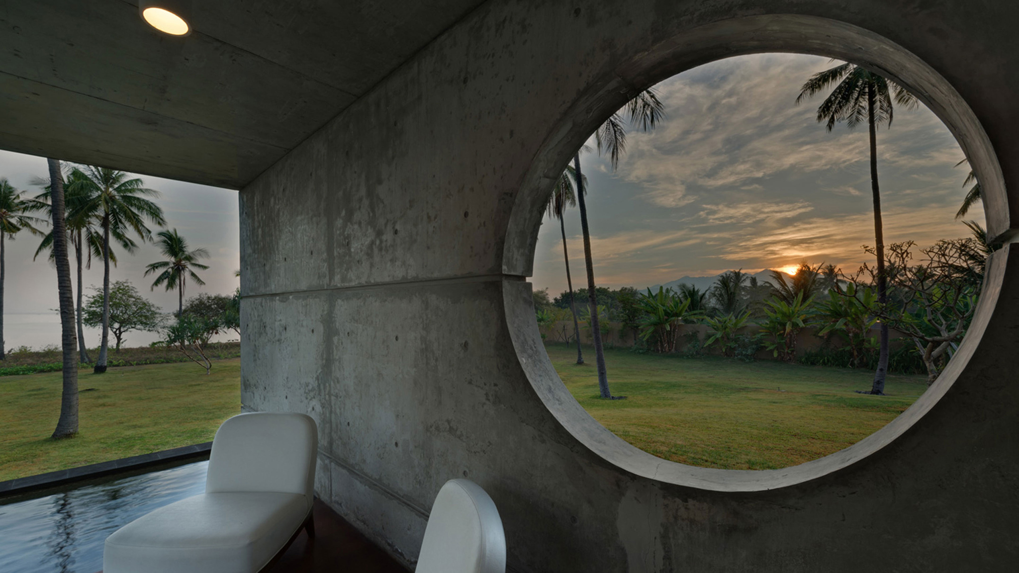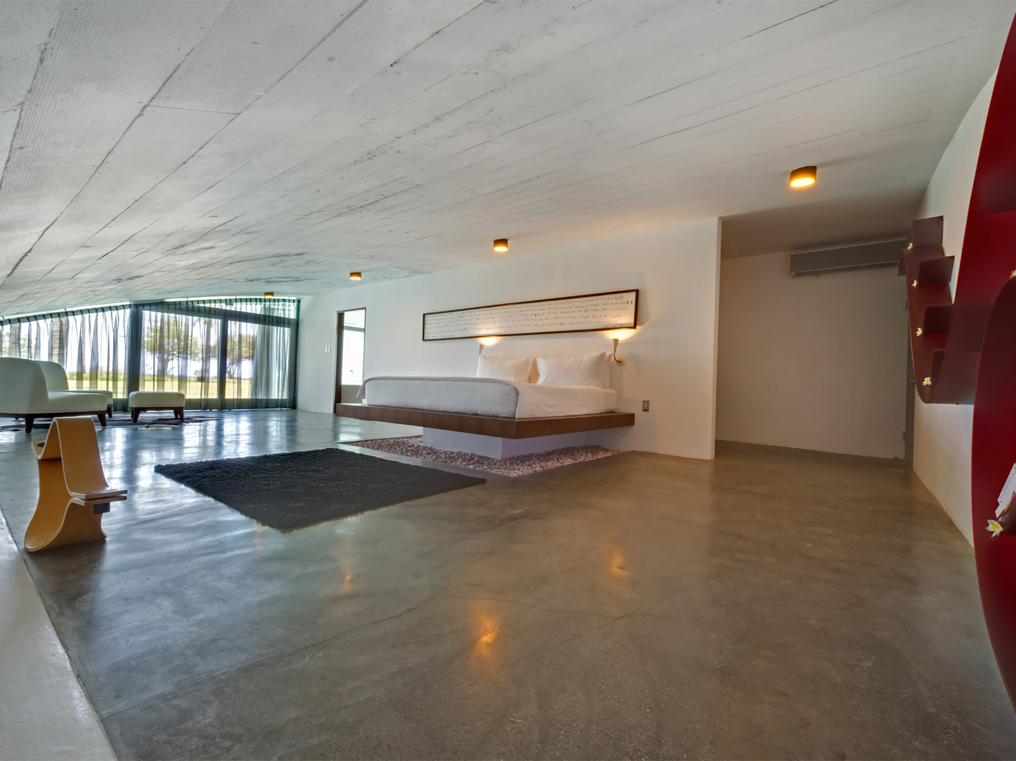 The guesthouse features an open-sided communal sitting area, and two bedrooms, each complemented by a seven-metre swimming pool. One of the bedrooms is on the same level as the sitting area while the other is subterranean, shaped like a quarter-pipe with a curved roof. Each is air-conditioned, furnished with a king bed, and adjoined by a bathroom with a tub facing the sea, and an indoor and outdoor shower.