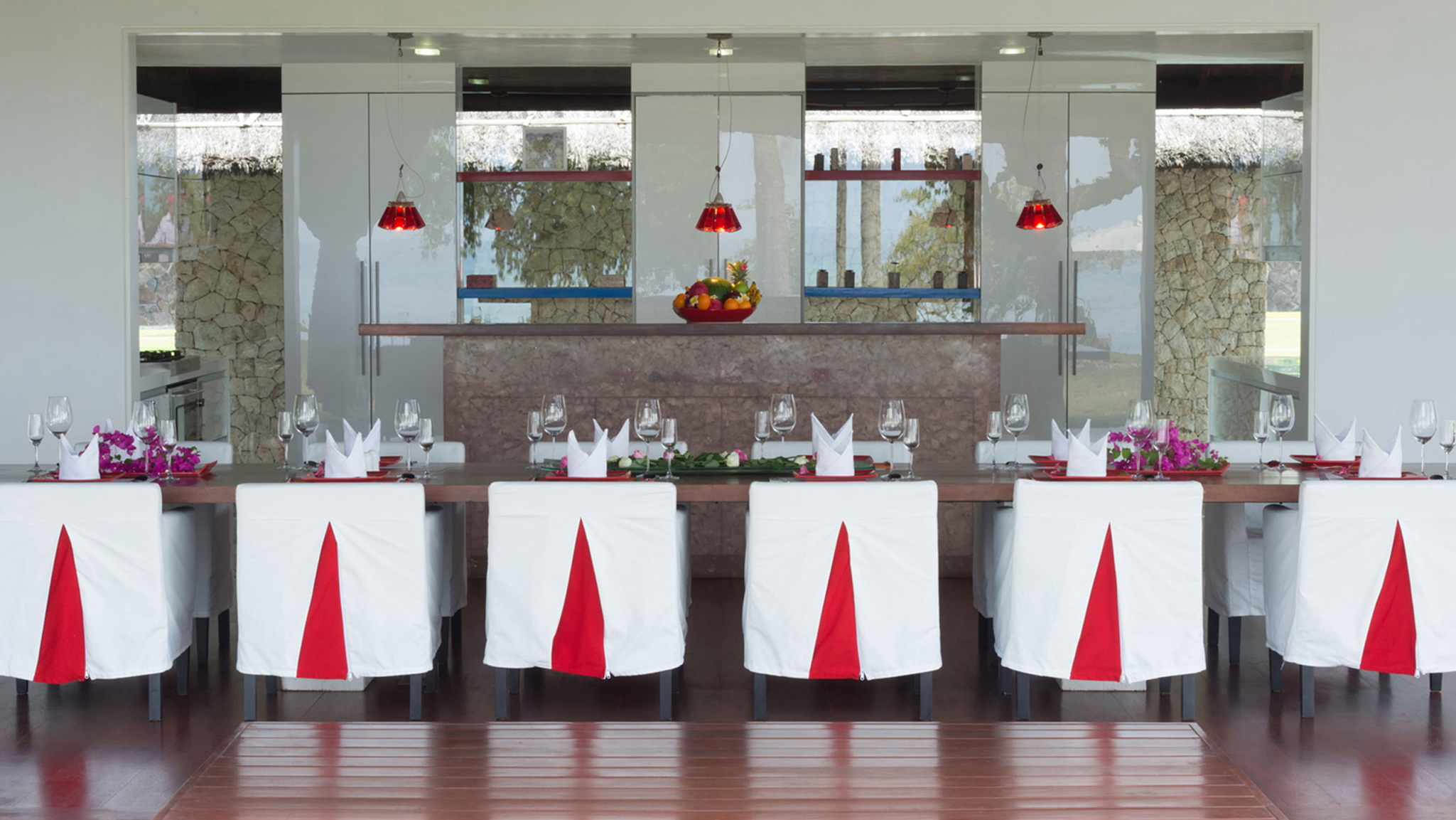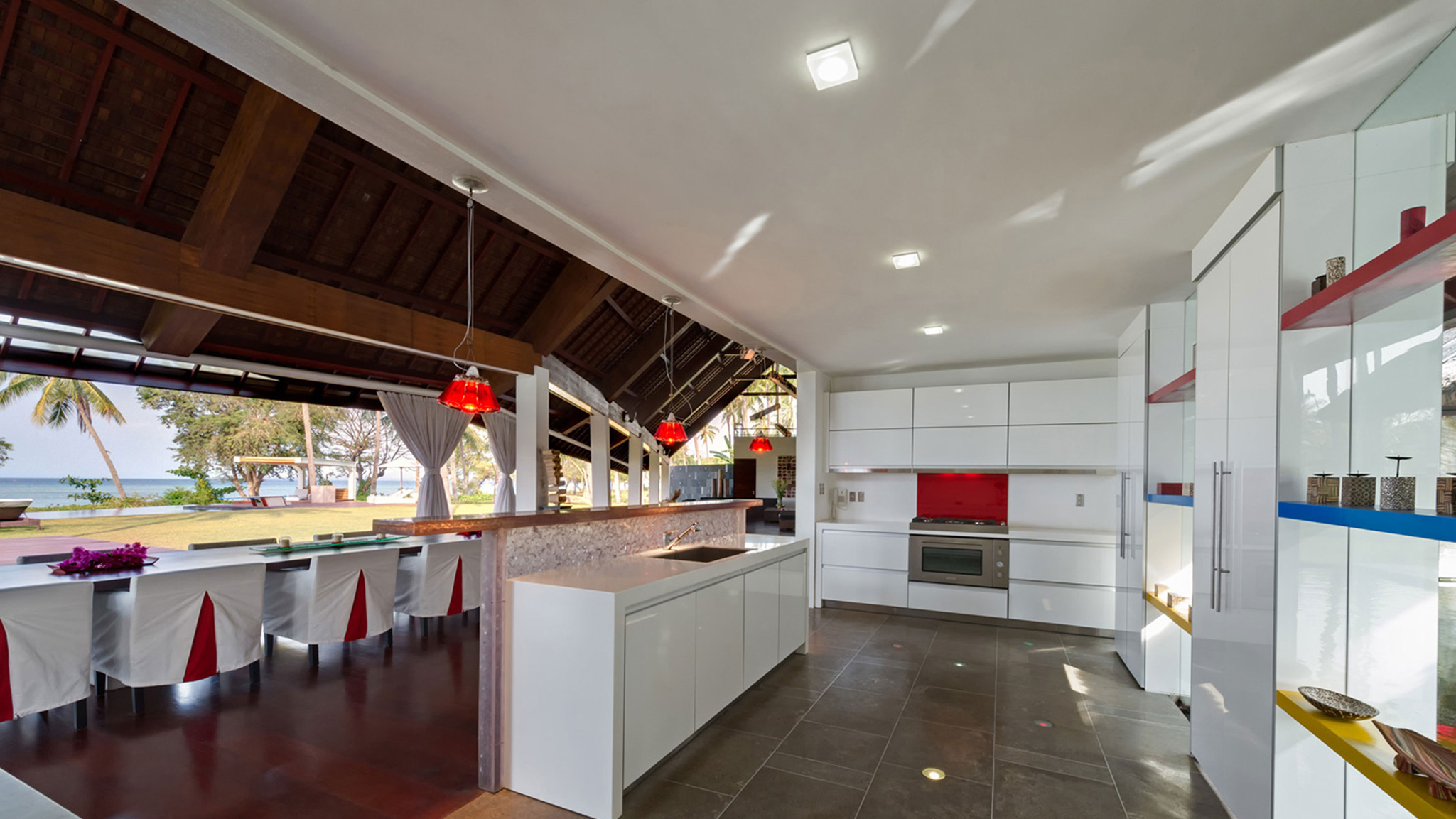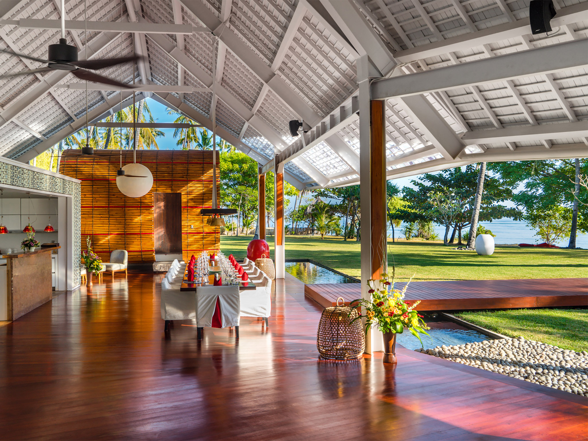 Running parallel to the beach, the main building presents a vast open-fronted living and dining space under a splendid timber-lined roof. A table for 12 sits next to a gleaming white-lacquered feature kitchen with a resin service bar lit by a three brilliant-red Campari Soda bottle lamps. Behind the white kitchen, linked by a bridge, is a traditionally styled Lombok cottage, which appears to float upon a moat. With its random rock walls and thatched roof, the cottage is actually a cutting-edge working kitchen. The glass-sided home theatre is another contrasting building, showcasing space-age architecture with a bamboo roof designed to resemble the caterpillar tracks of a combat tank that will transport guests to a new level of entertainment. The room is equipped with nine beanbags, a 52-inch satellite-channel TV, DVD player and surround-sound.