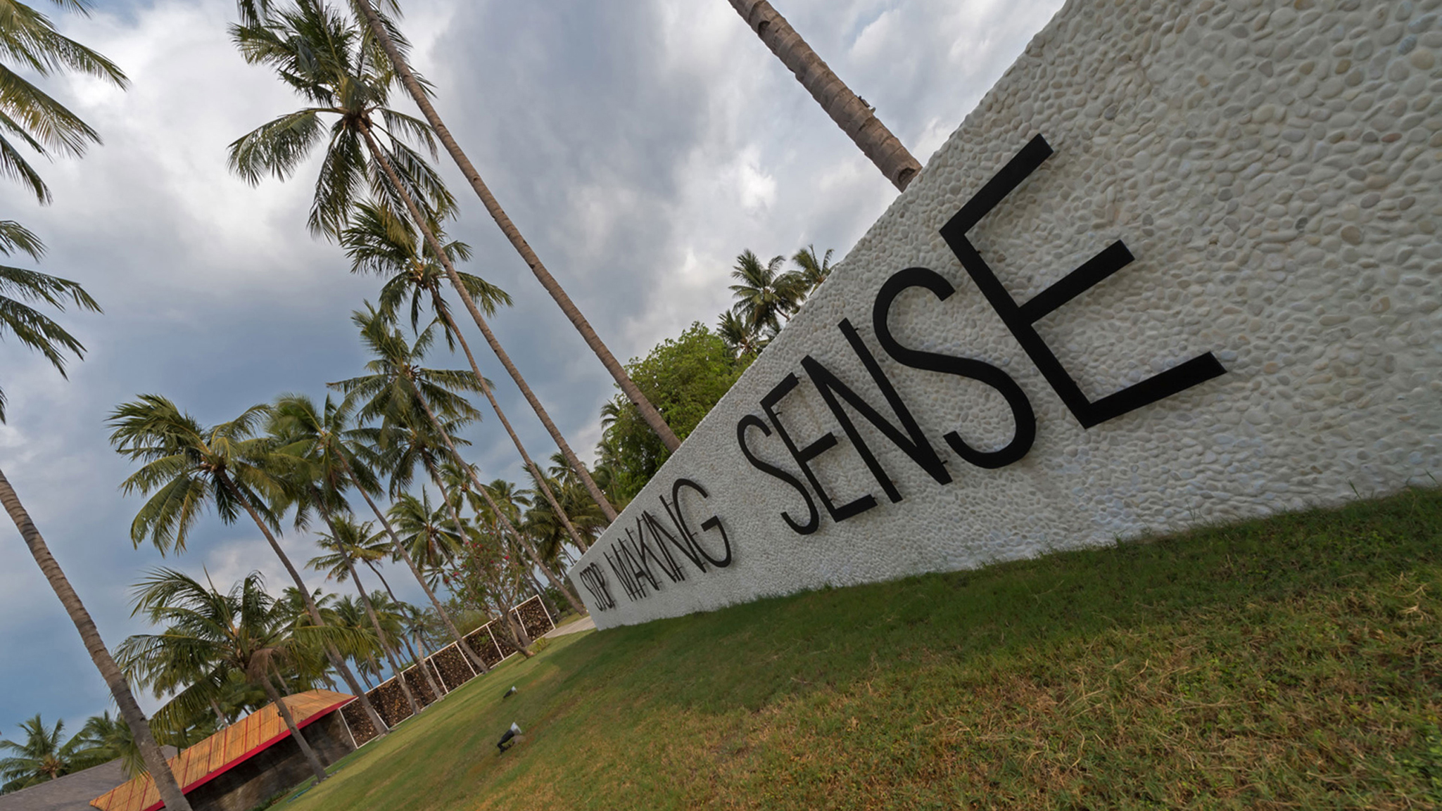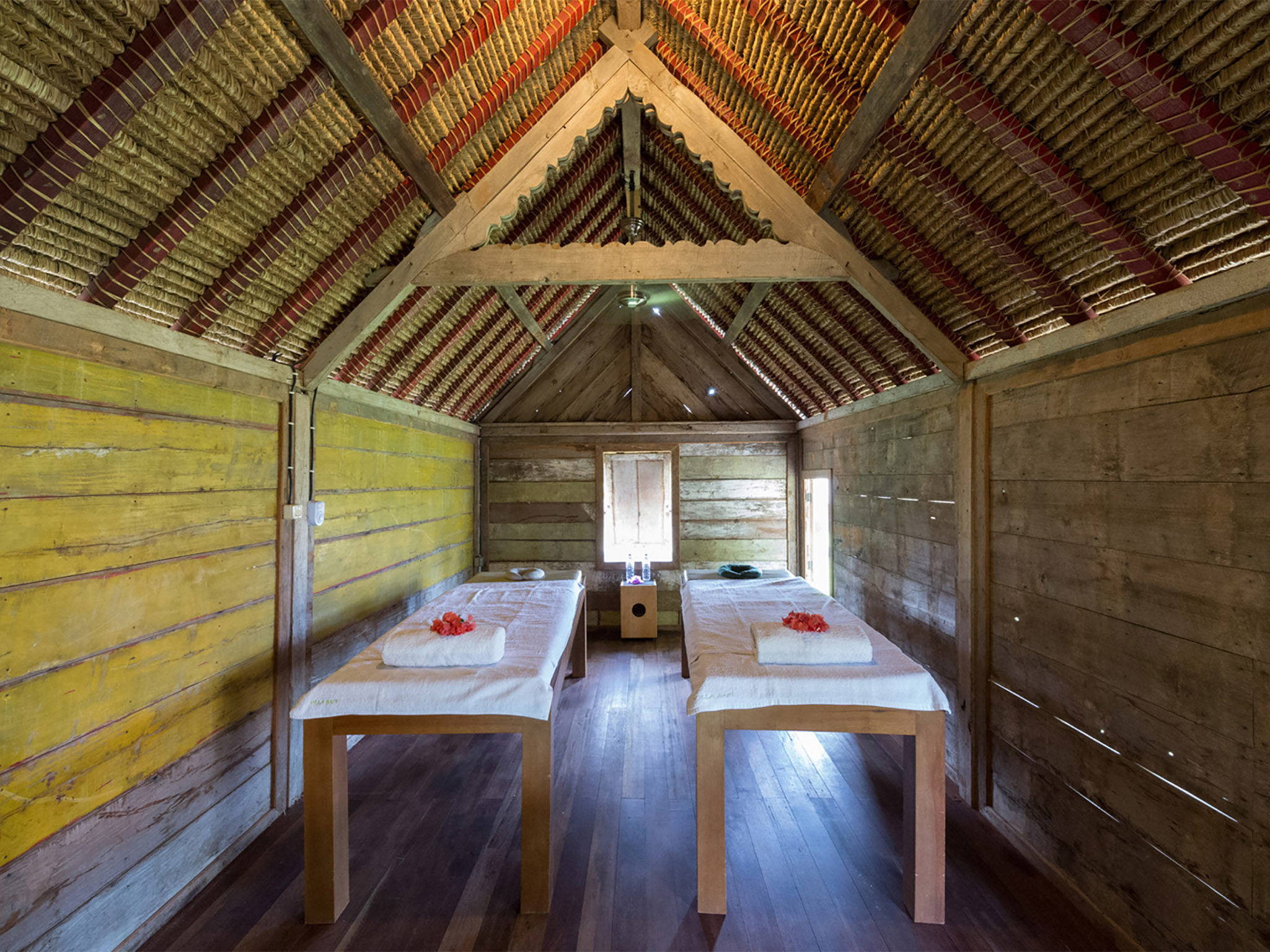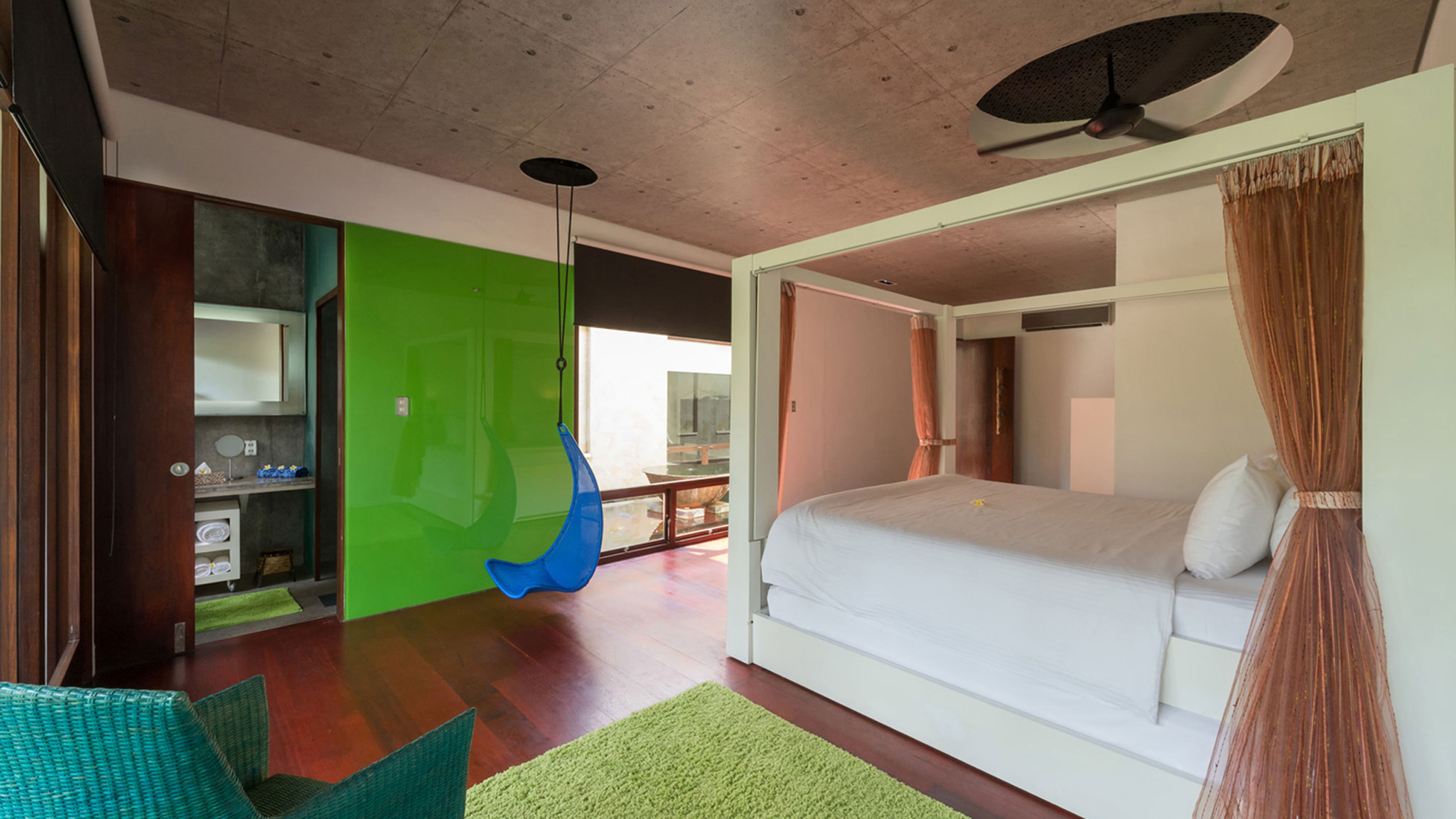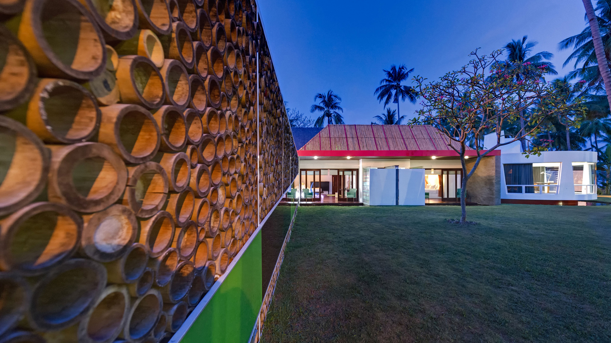 lumbung (rice barn), which serves as a massage pavilion. The interiors carry a signature colour theme of black, red and lime green, while the walls are filled with conceptual artwork.