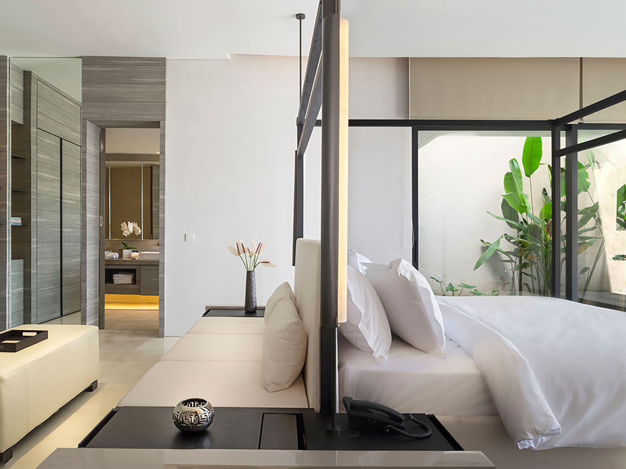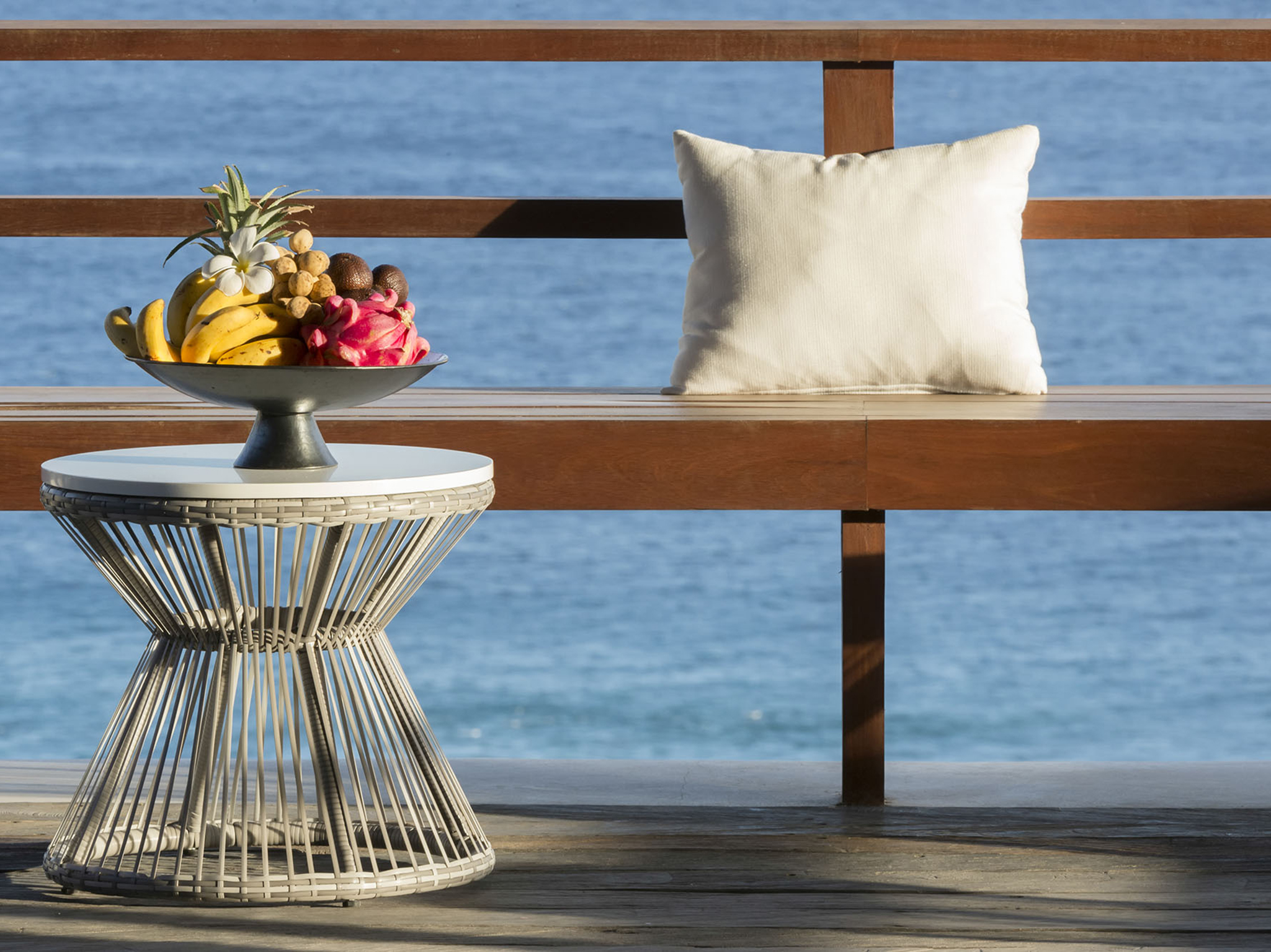 Across the lawn, at one end of the 22-metre swimming pool, is the entertainment balé with chill-out modular seating, kitchenette and barbecue area, and those killer ocean views. Discreetly tucked away below are the sauna, steam room and massage room, and a large well-equipped gym (shared with the neighboring Villa Hamsa) opening onto a cliff-edge garden.