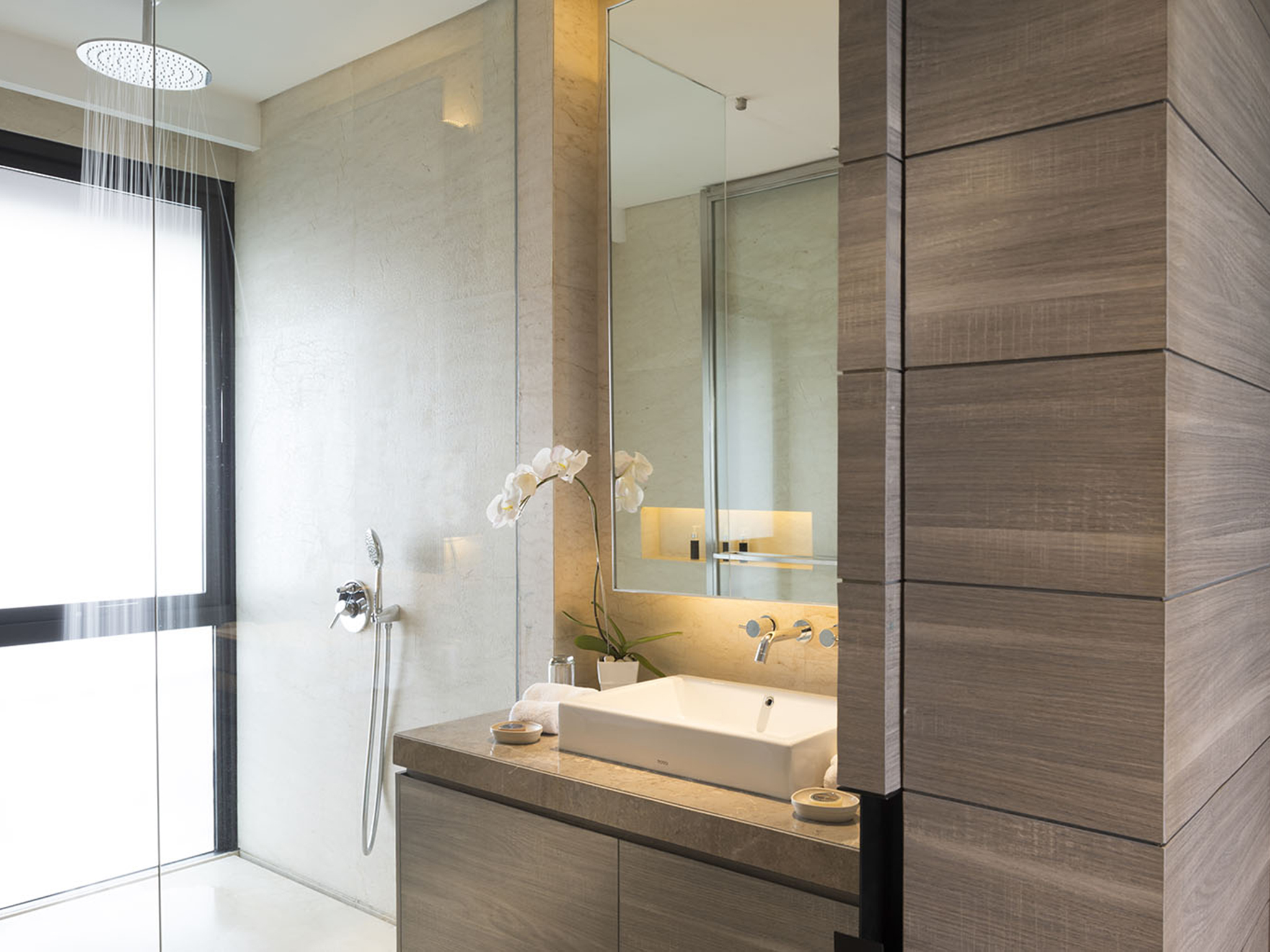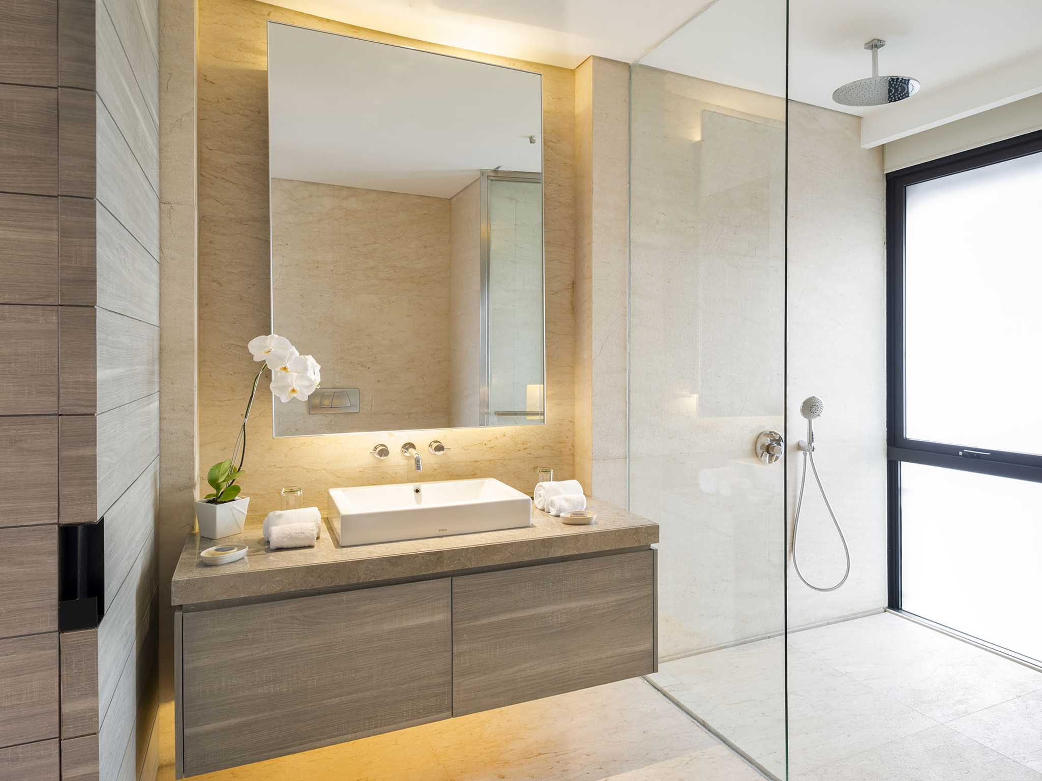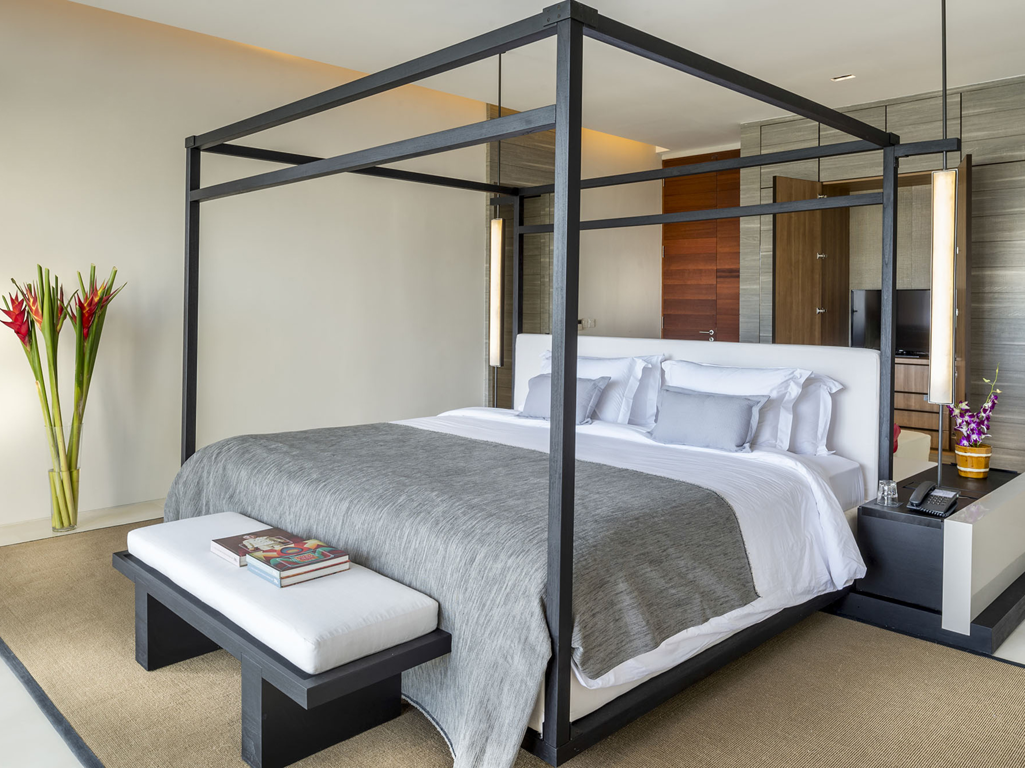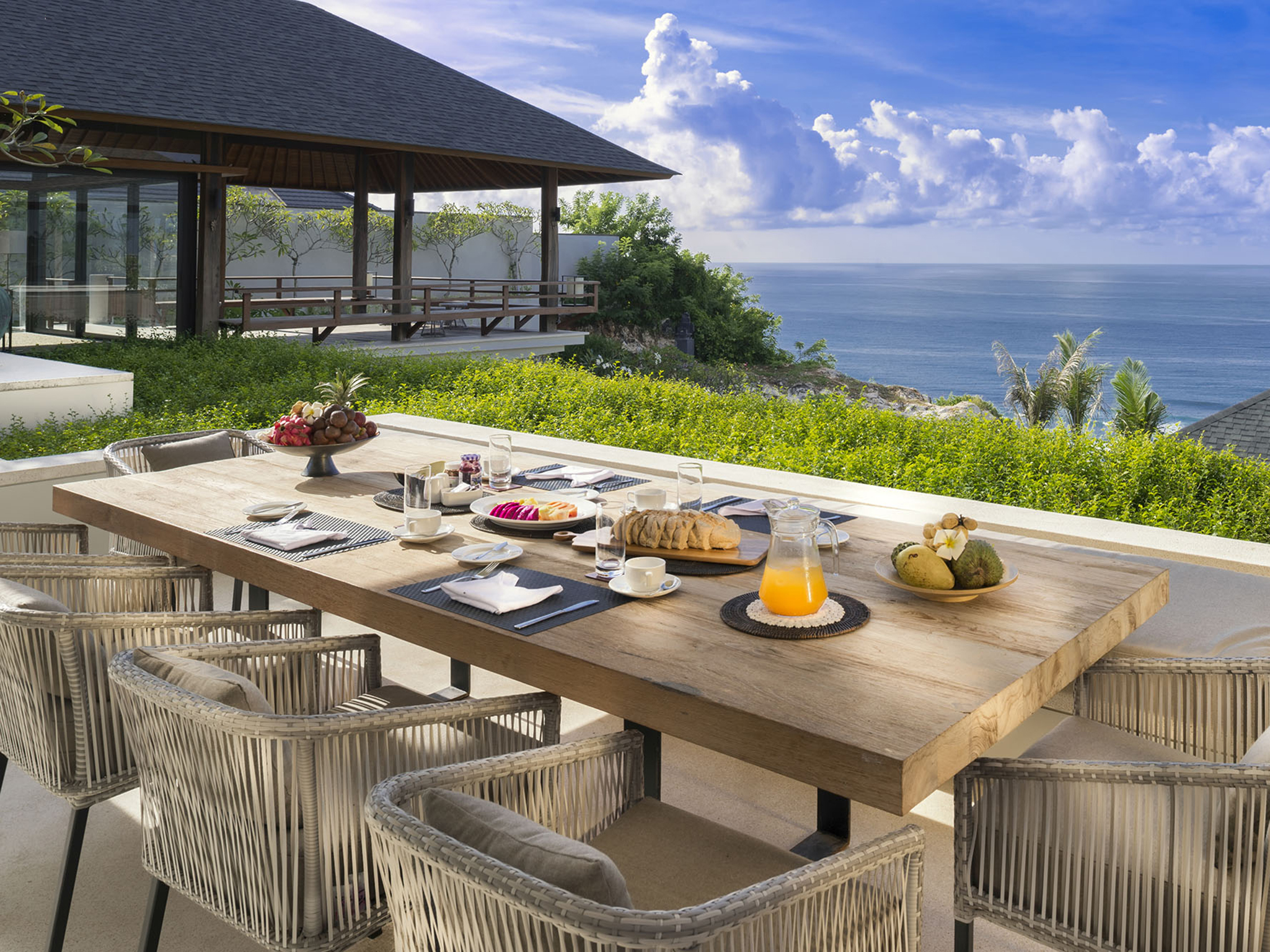 Stepping through the Ironwood doors onto Villa Soham’s entrance terrace, the ocean vista that greets guests is an arresting sight; rest assured, you get to enjoy the view from nearly every room in this magnificent home! On this level, there’s an alfresco dining terrace to one side (behind which is the professional kitchen as well as guest cloakroom). To the other is the huge air-conditioned living pavilion, with formal dining area and butler’s pantry, and separate media room.