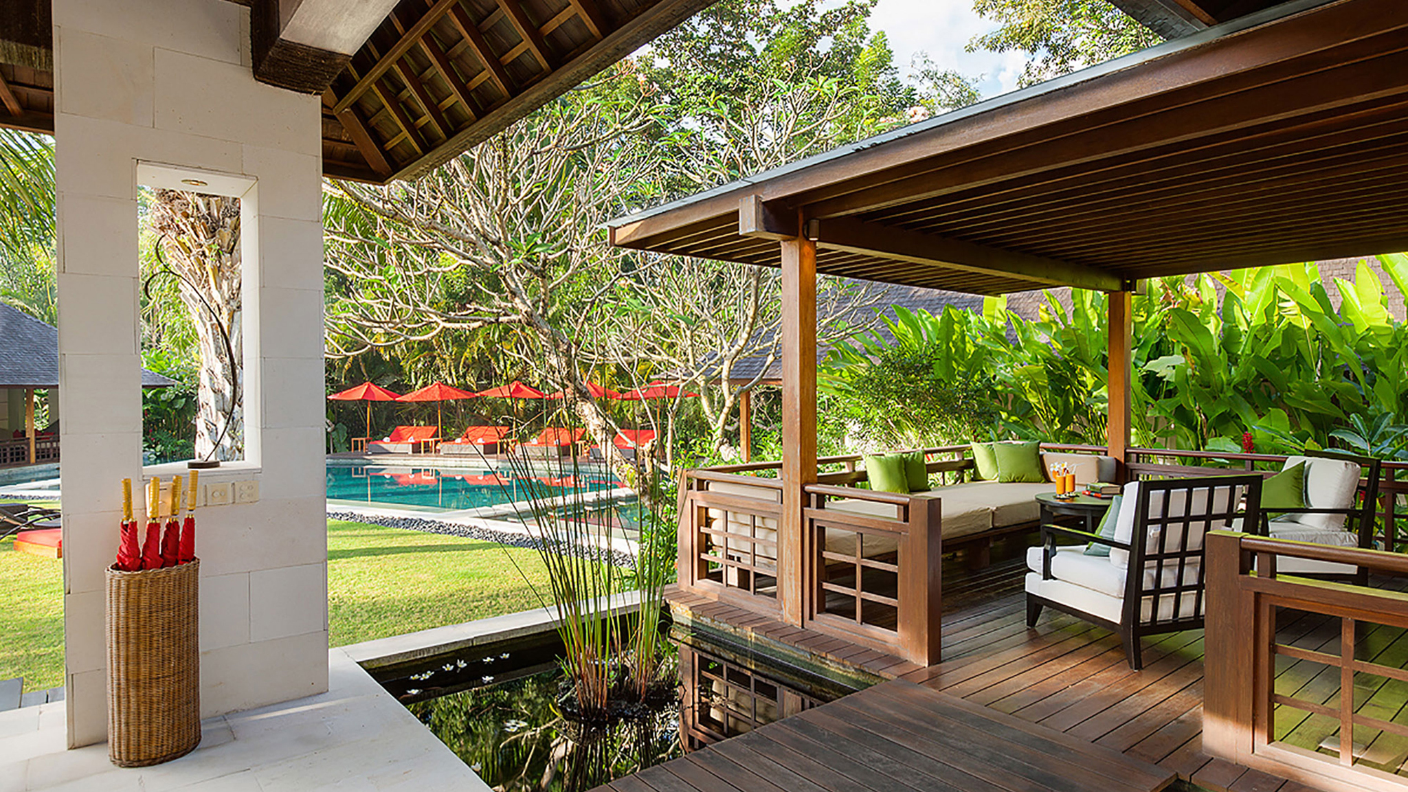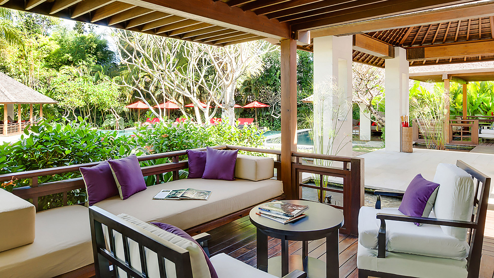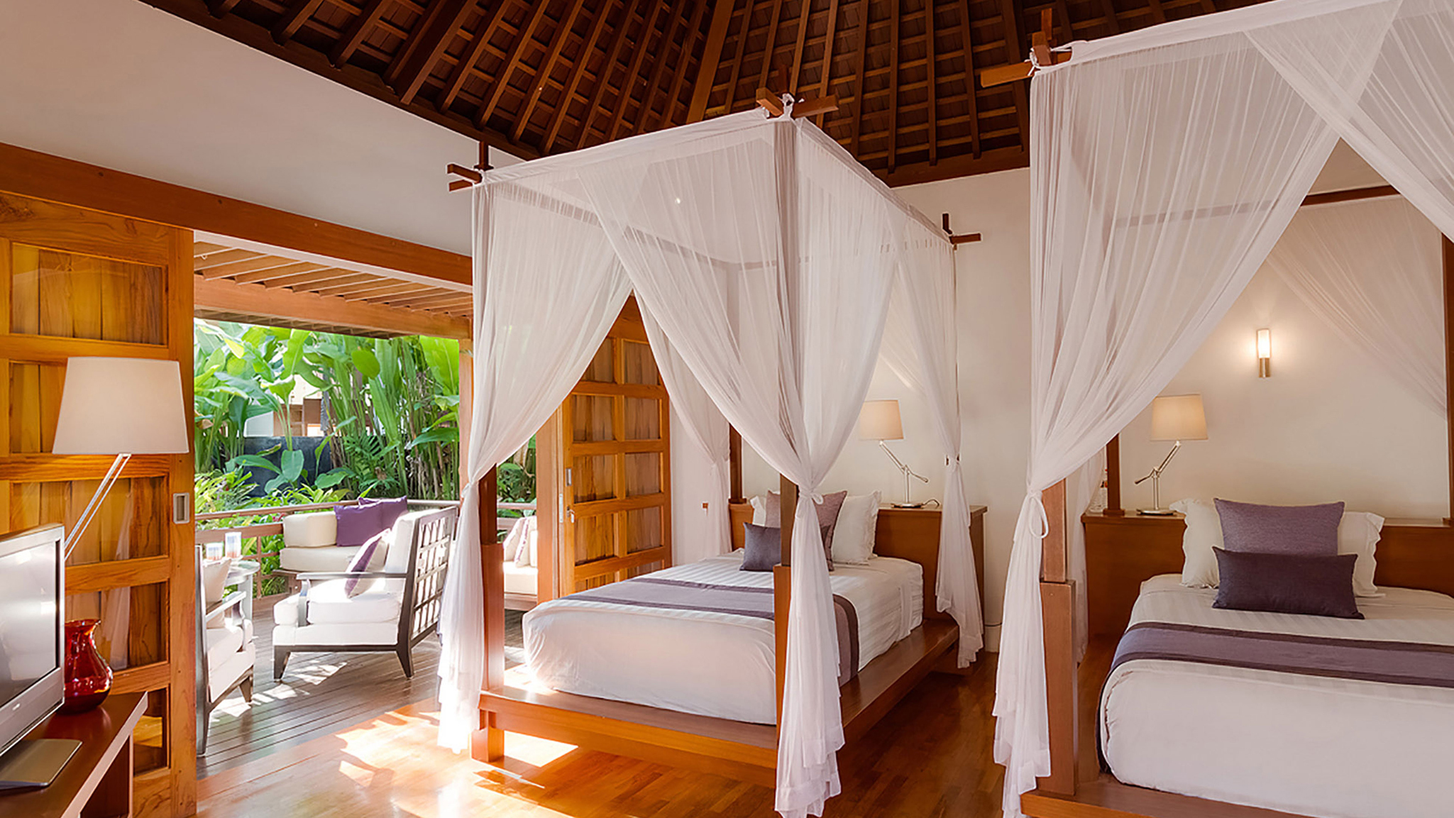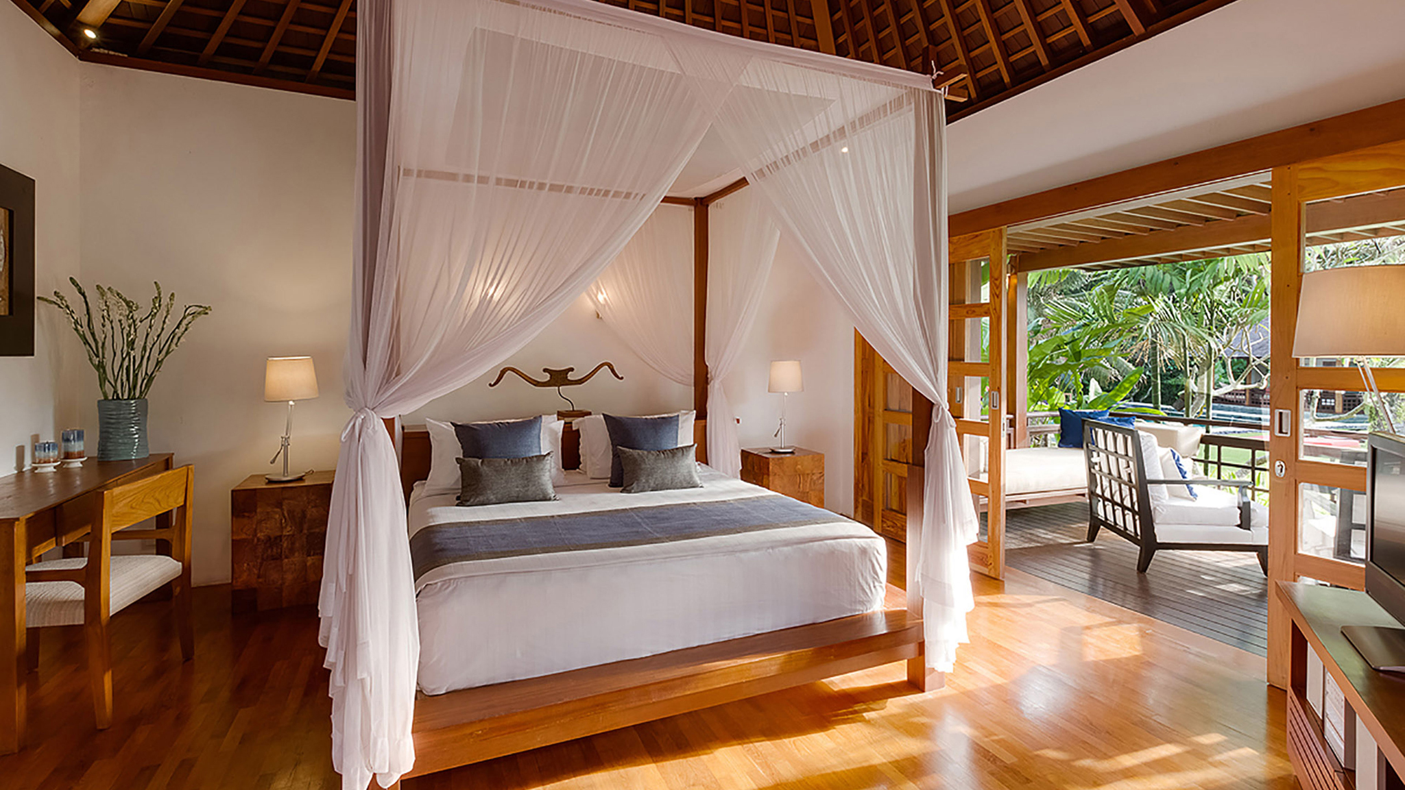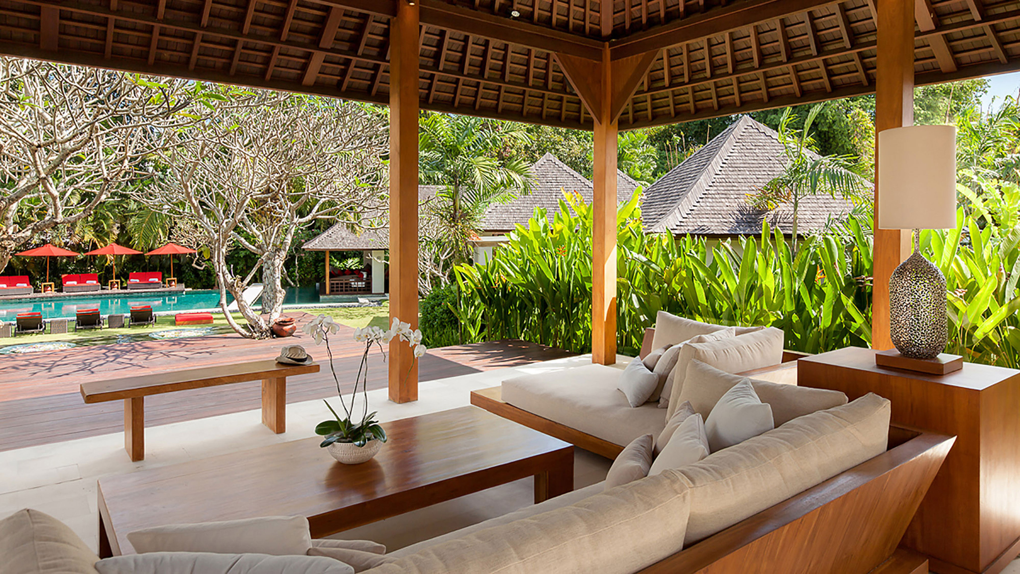 Vaulted ceilings, TVs with DVD players, stereos and air-conditioning feature in all six bedrooms. Sliding wood-weave doors, mature gardens and koi-carp-filled ponds give each bedroom its own space and a sense of privacy.