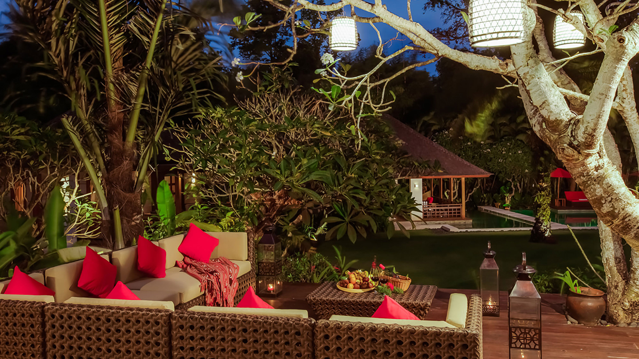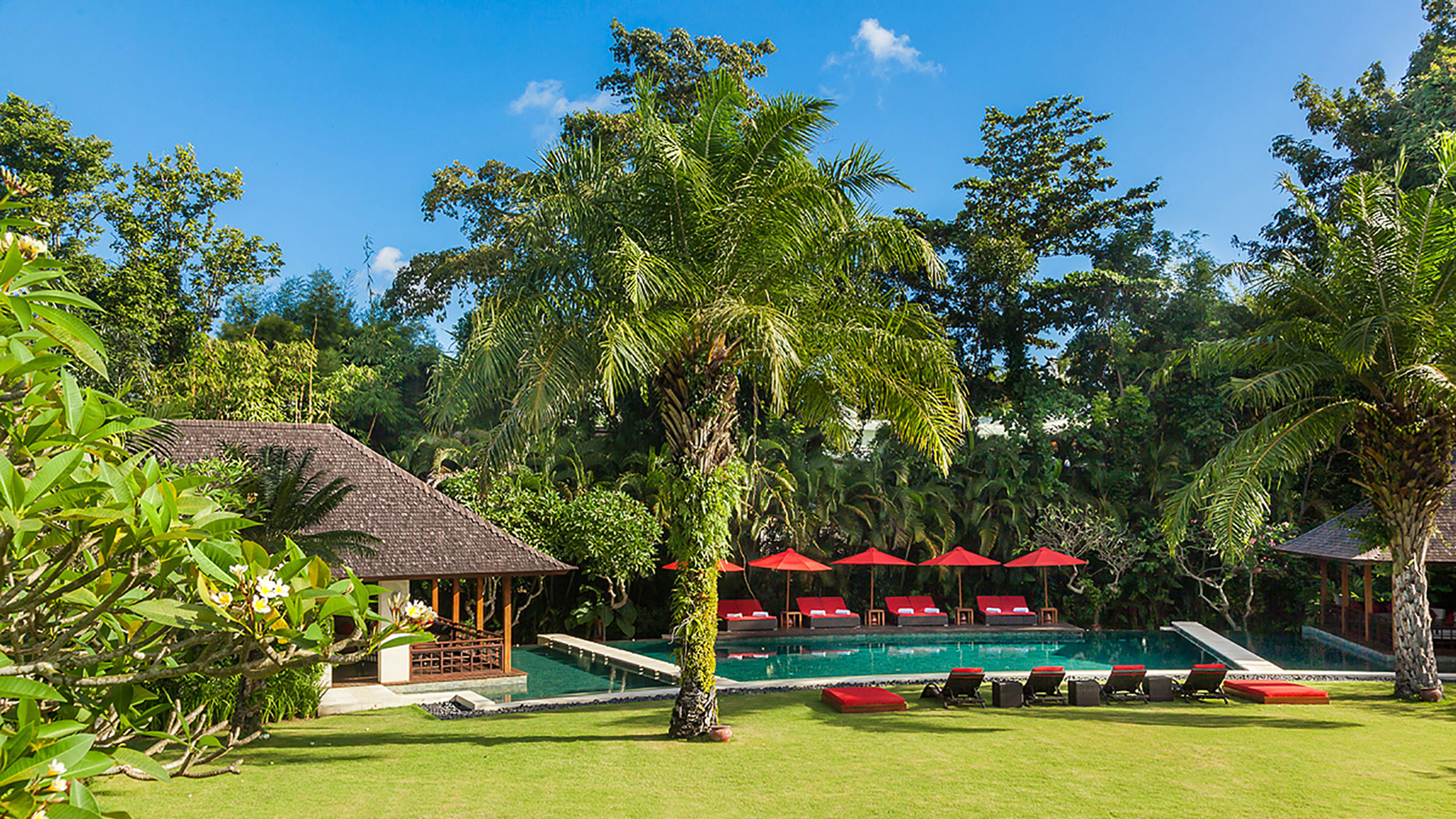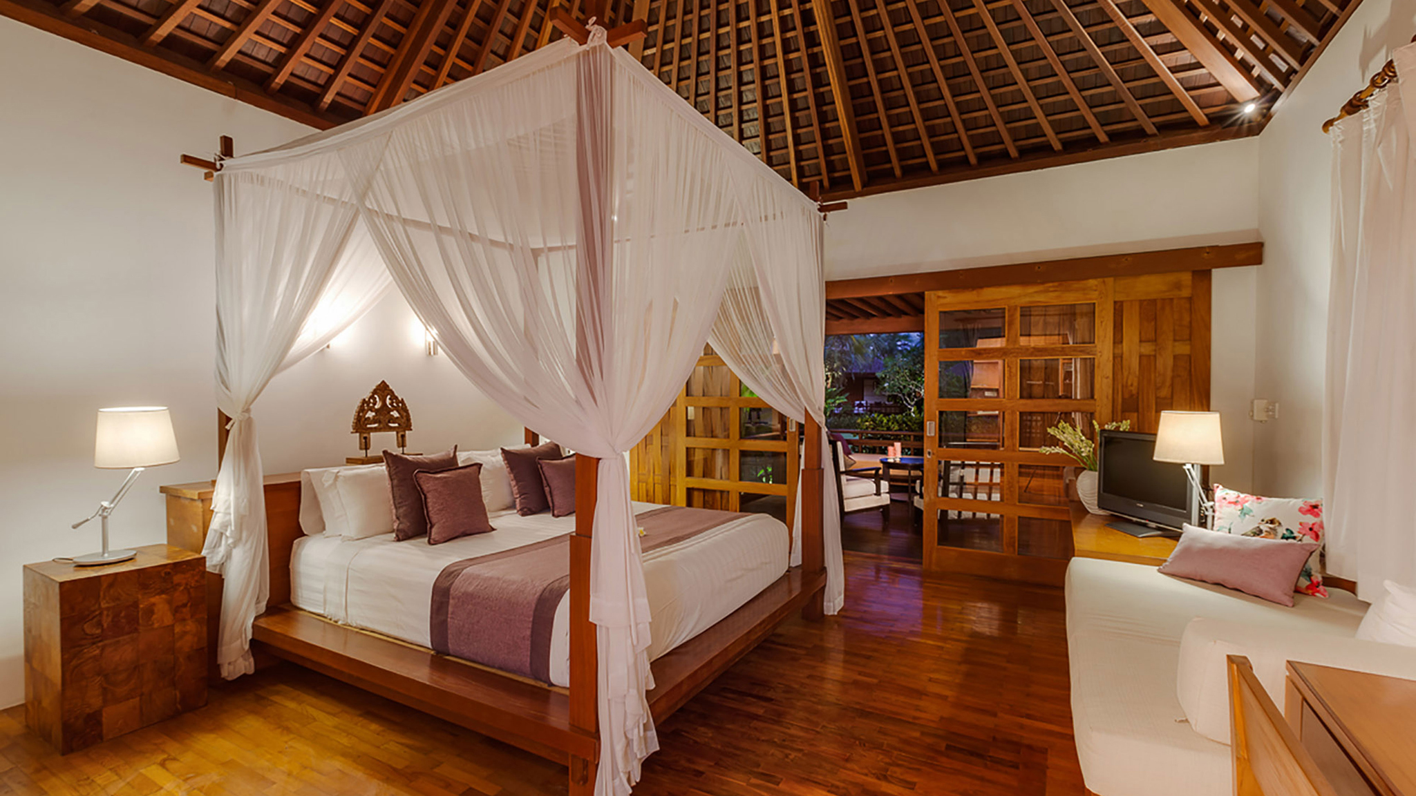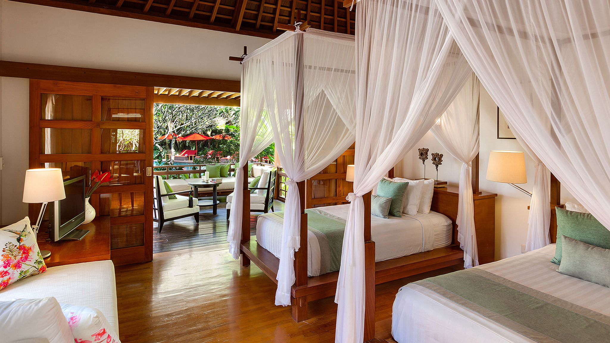 Vaulted ceilings, TVs with DVD players, stereos and air-conditioning feature in all six bedrooms. Sliding wood-weave doors, mature gardens and koi-carp-filled ponds give each bedroom its own space and a sense of privacy.