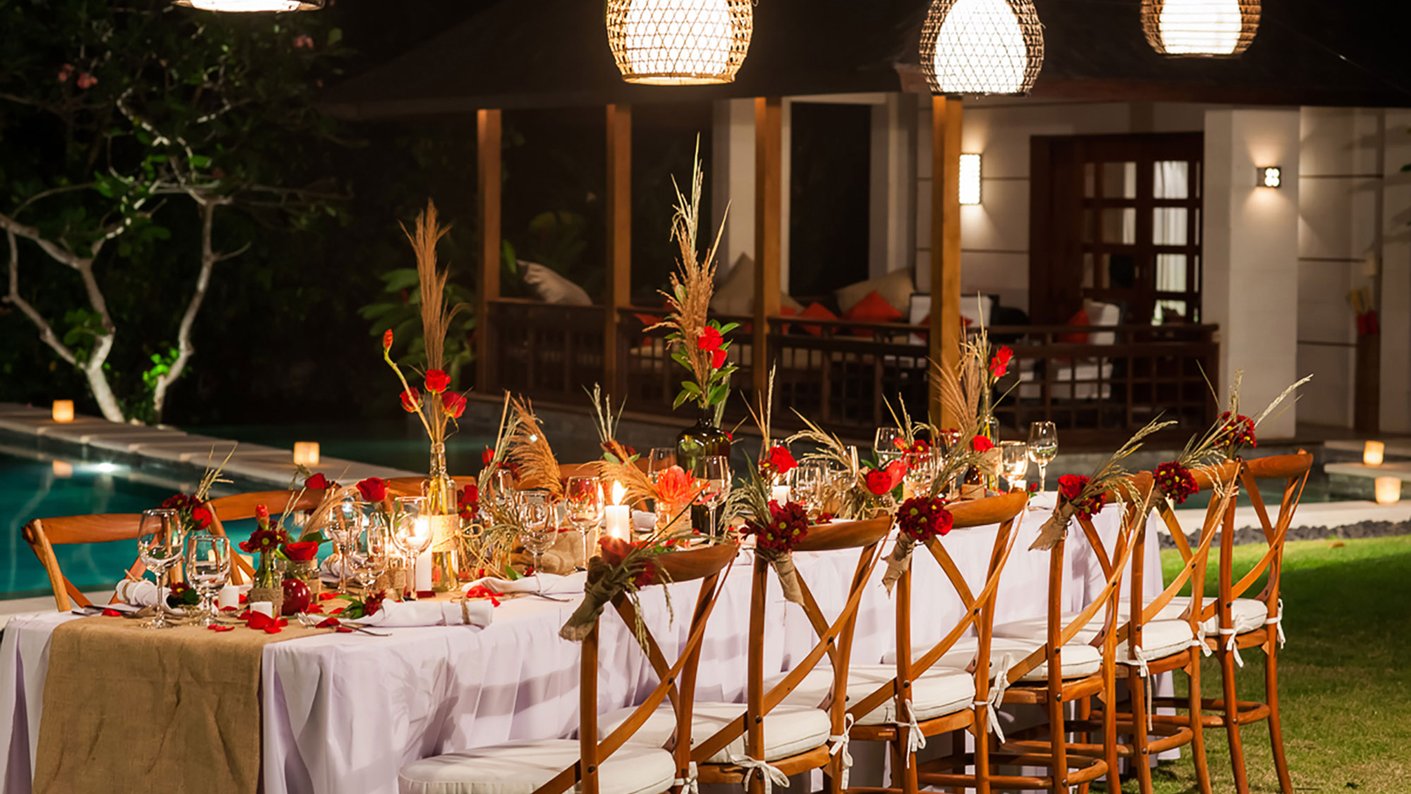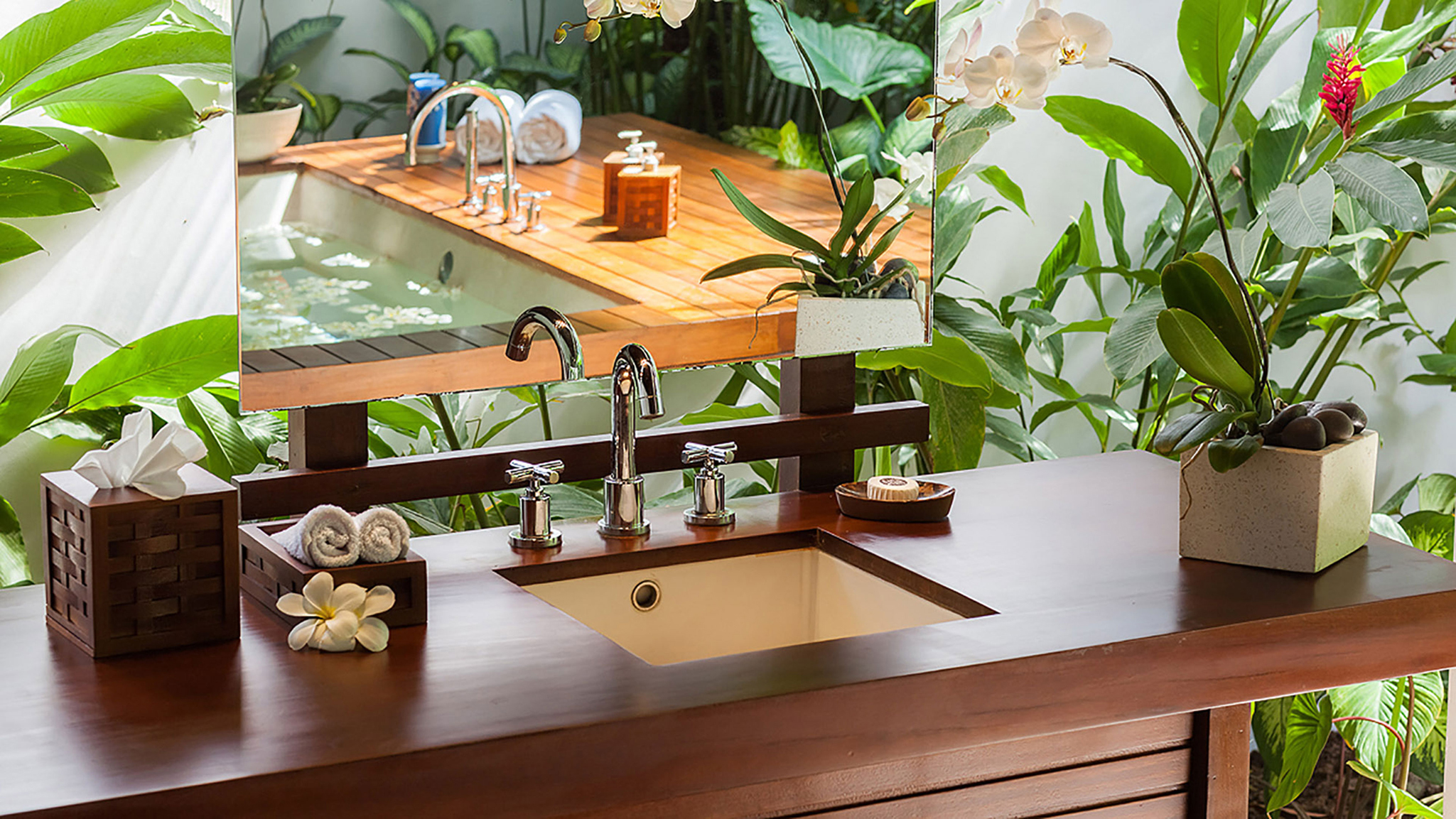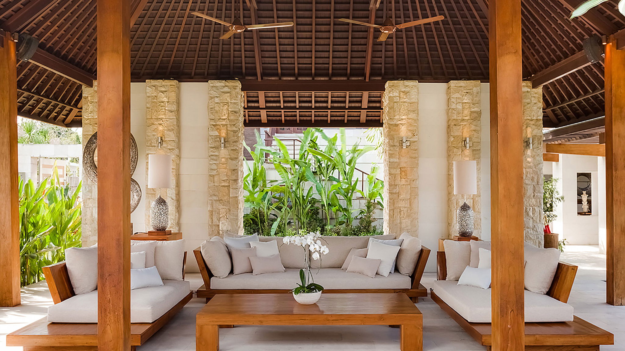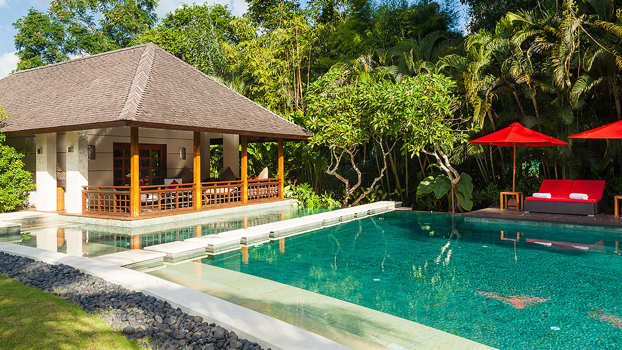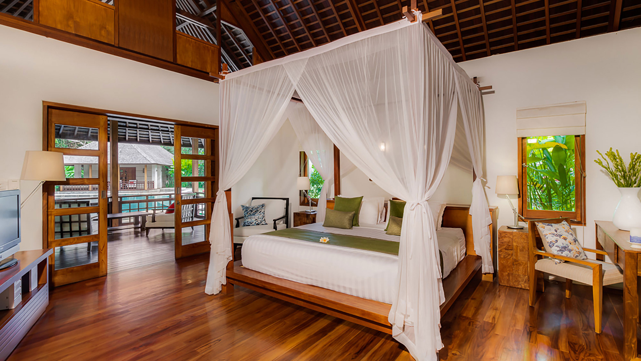 Vaulted ceilings, TVs with DVD players, stereos and air-conditioning feature in all six bedrooms. Sliding wood-weave doors, mature gardens and koi-carp-filled ponds give each bedroom its own space and a sense of privacy.