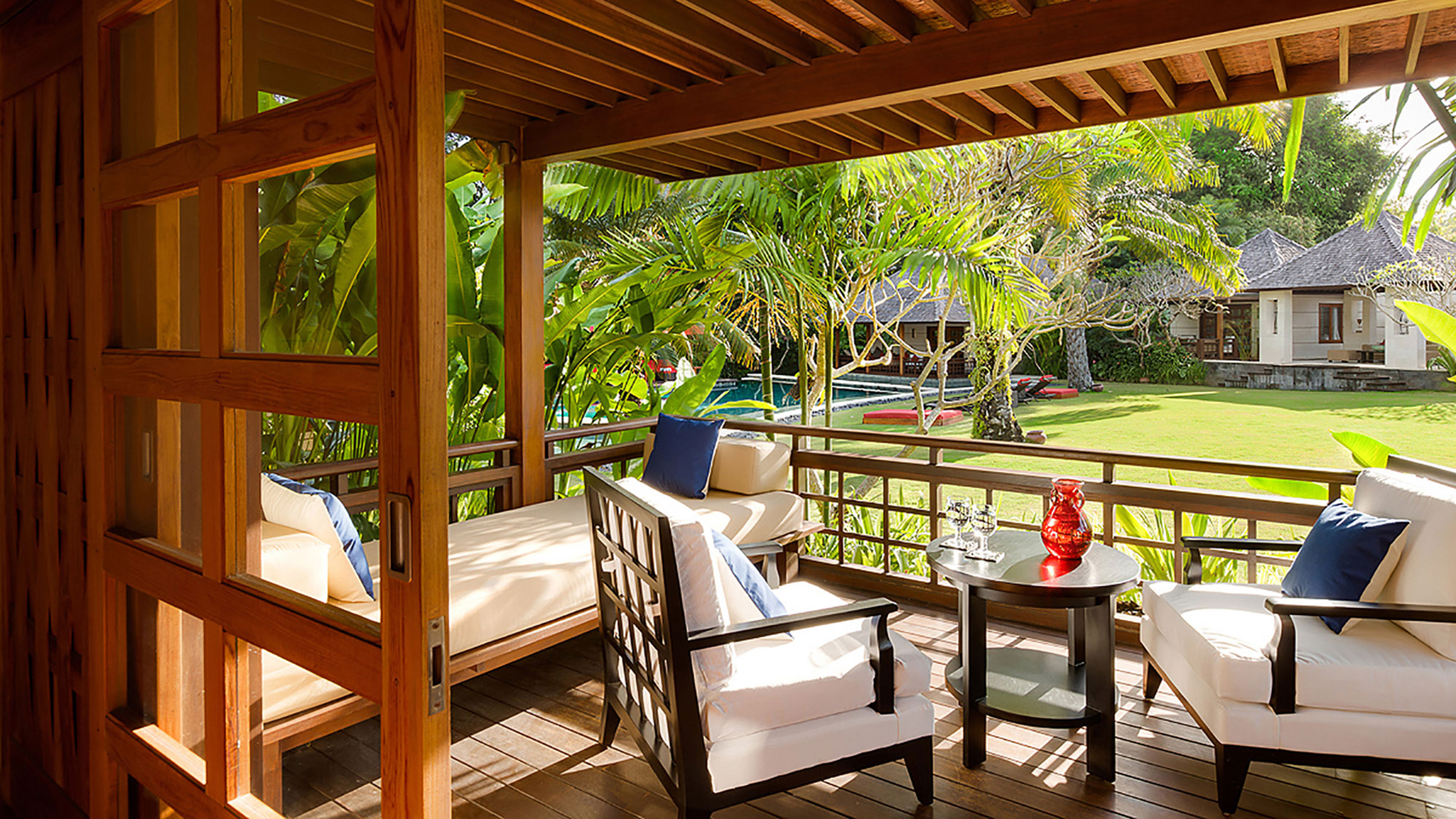 Entry into Villa The Beji is through an imposing cantilevered door standing two metres tall. Most of the villa is hidden until you reach the open-sided living room, where the full array of pavilions, lawn and swimming pool are revealed below.