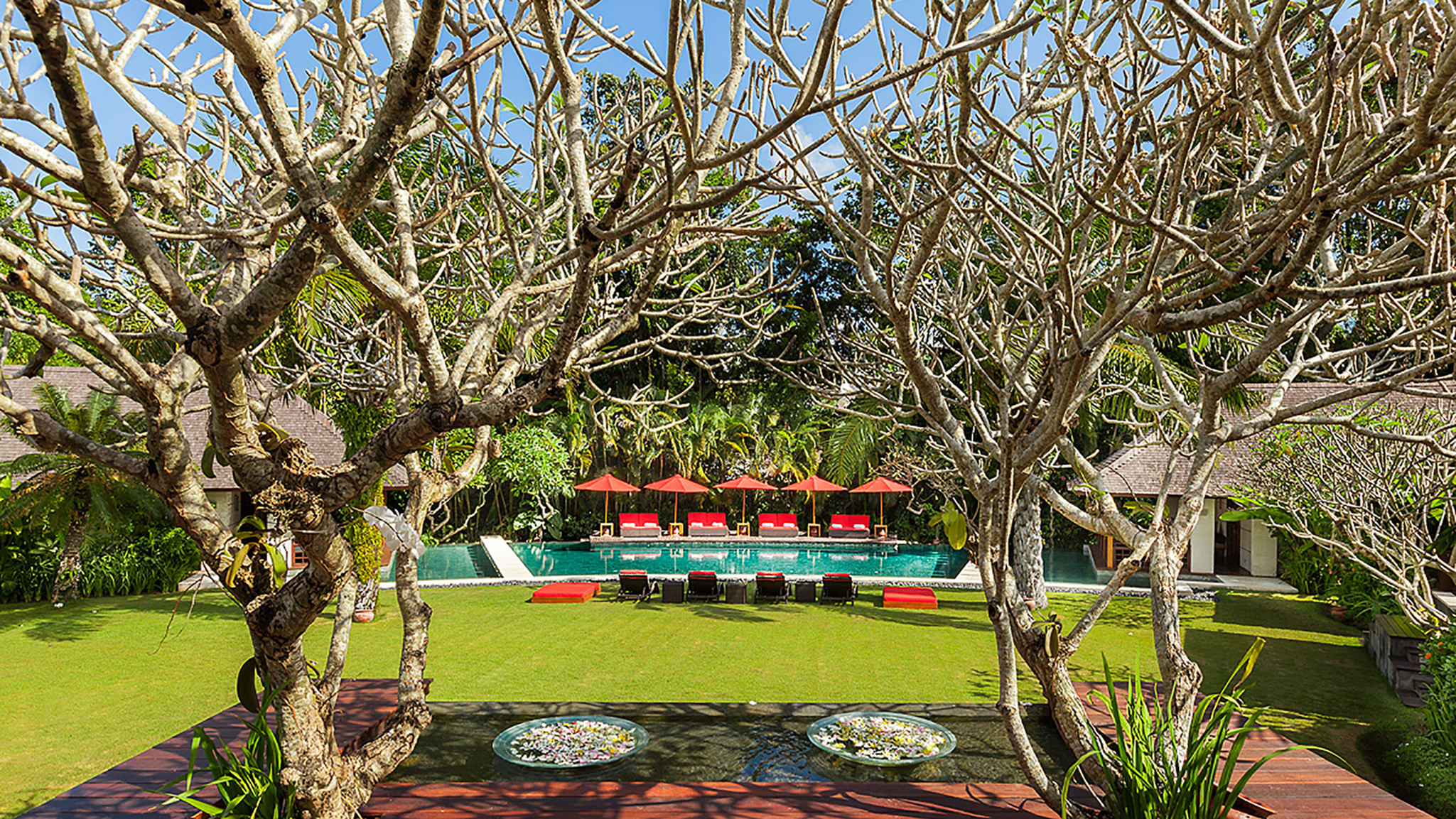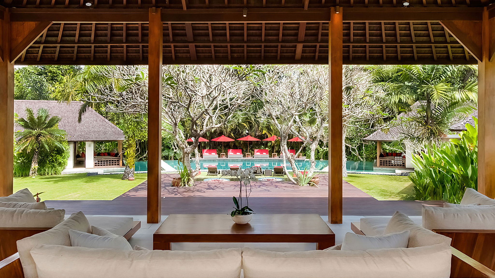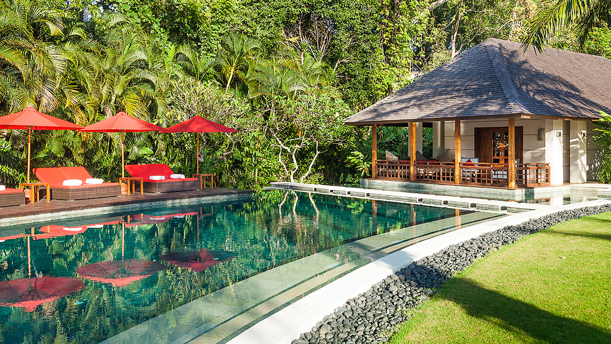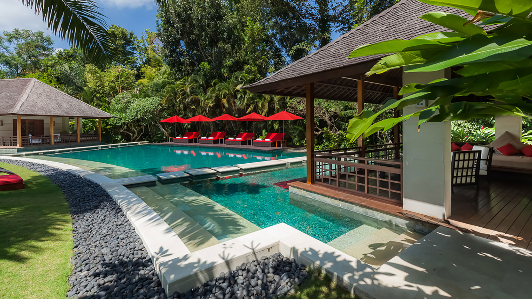The remaining four bedrooms are in pairs alongside the lawn. Each enjoys its own terrace, and similarly generous dressing areas and bathrooms with sunken baths and outside showers. A large decked living space is shared by each pair – an ideal place to spend a lazy afternoon out of the heat of the Bali sun.