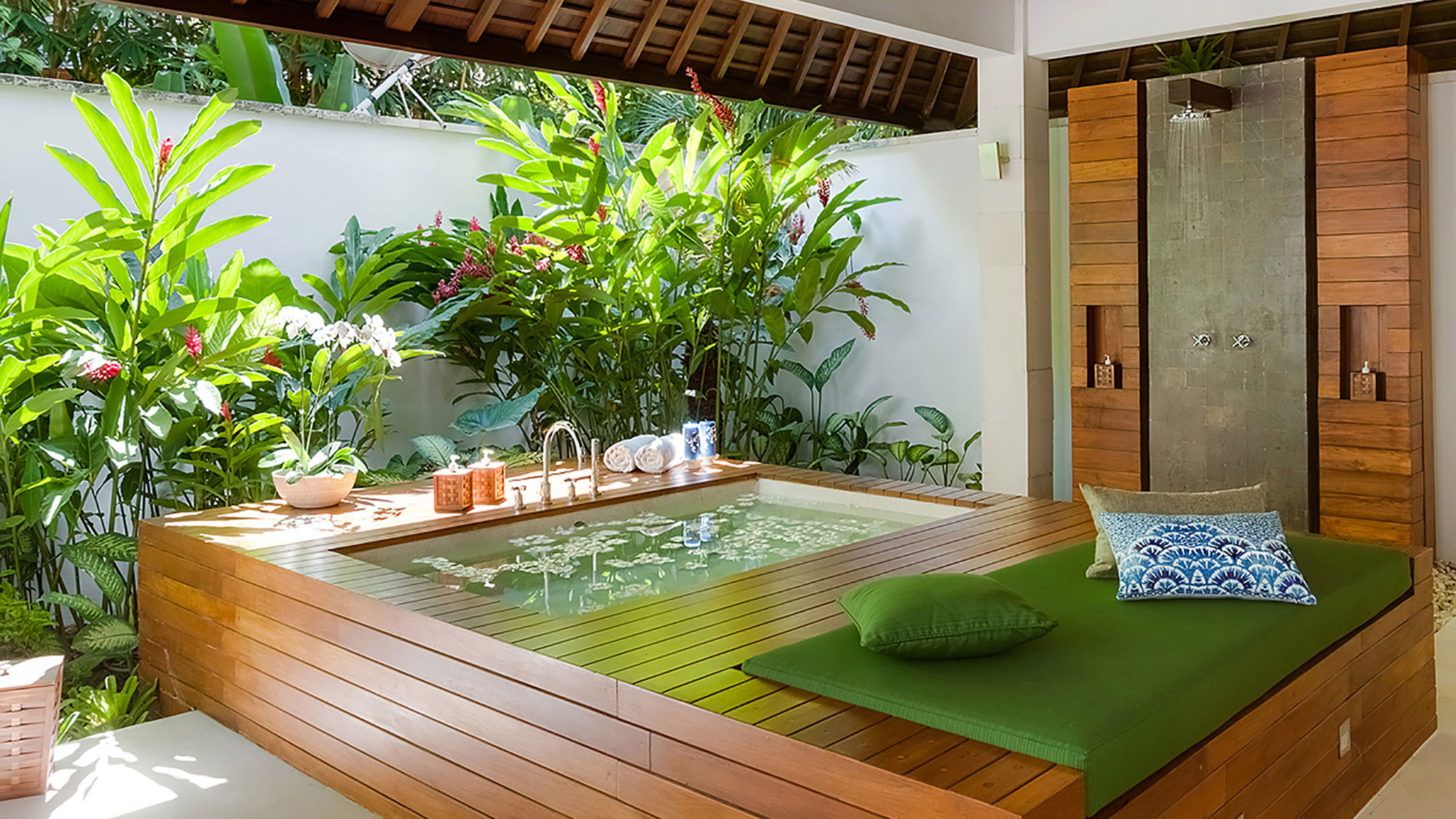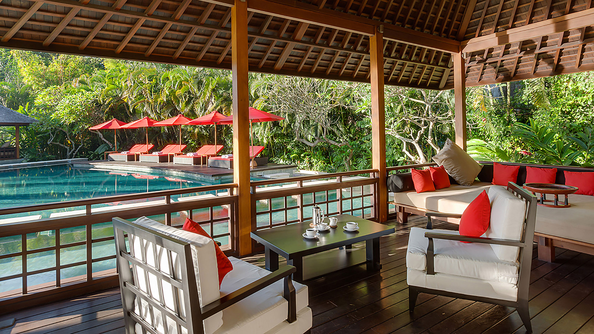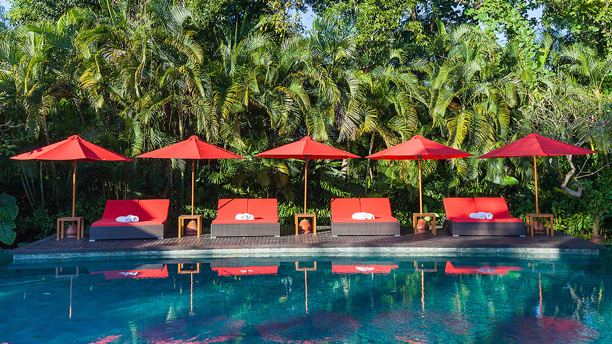 The remaining four bedrooms are in pairs alongside the lawn. Each enjoys its own terrace, and similarly generous dressing areas and bathrooms with sunken baths and outside showers. A large decked living space is shared by each pair – an ideal place to spend a lazy afternoon out of the heat of the Bali sun.