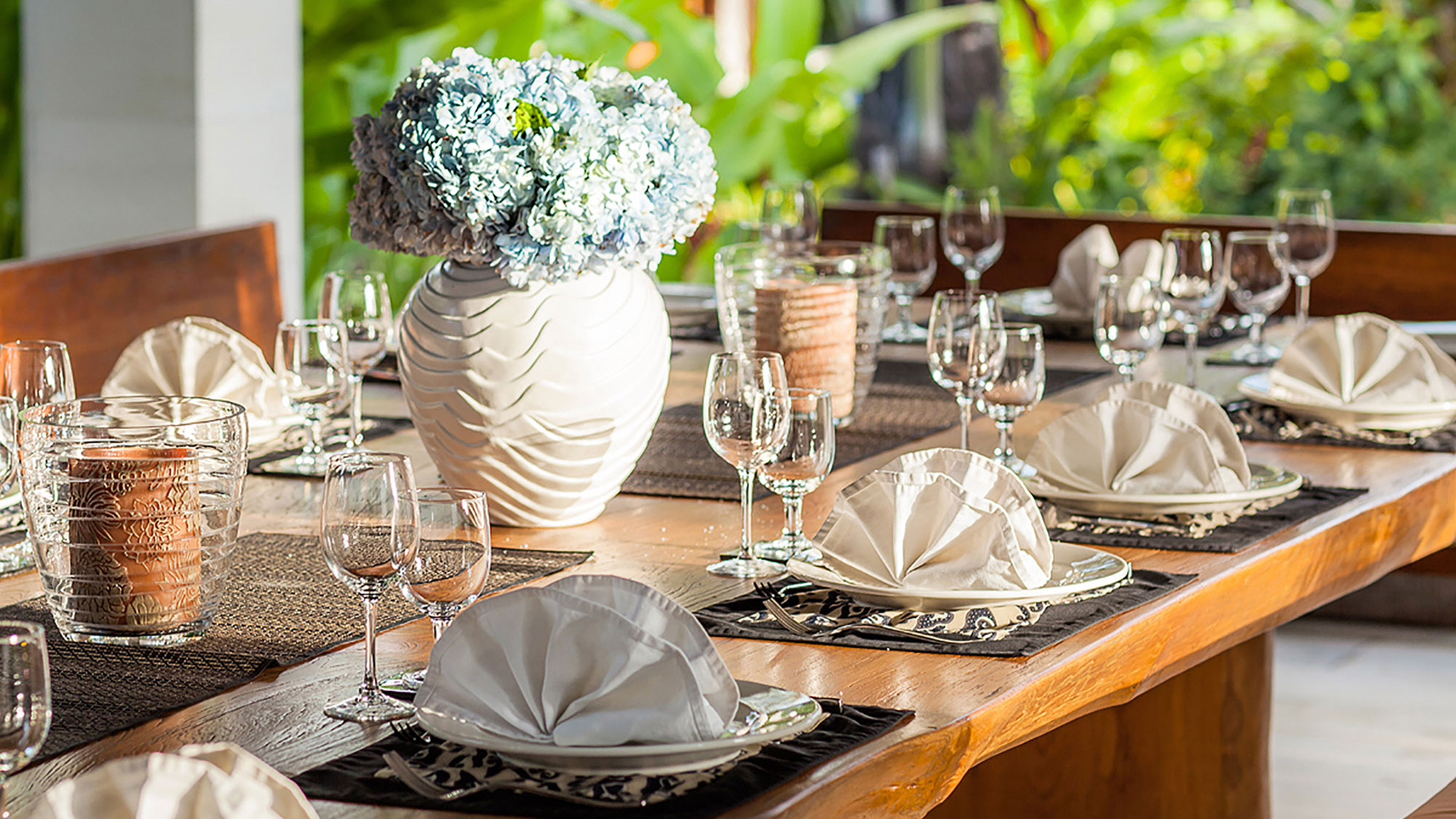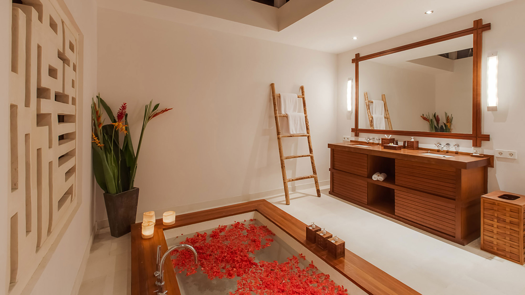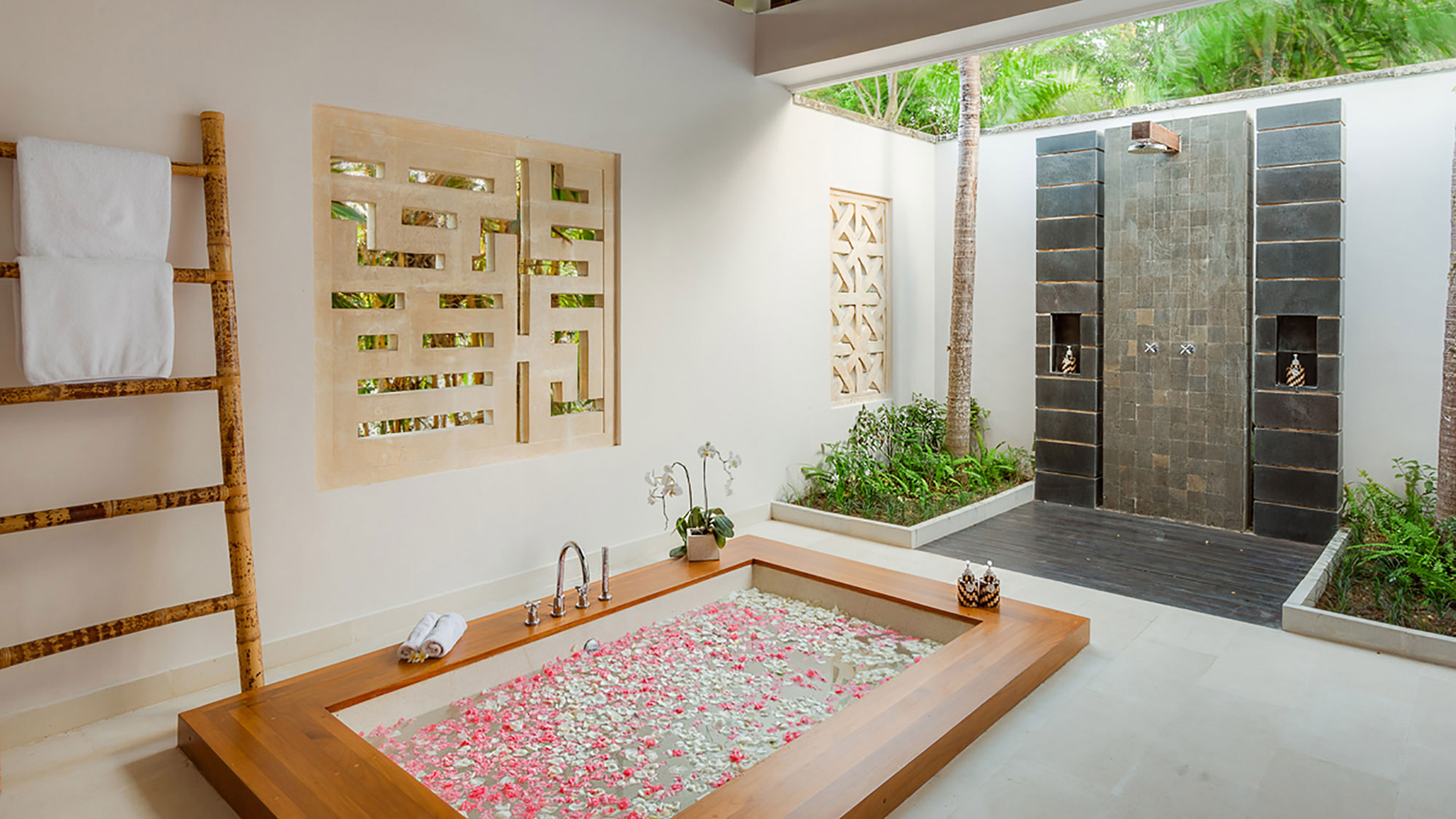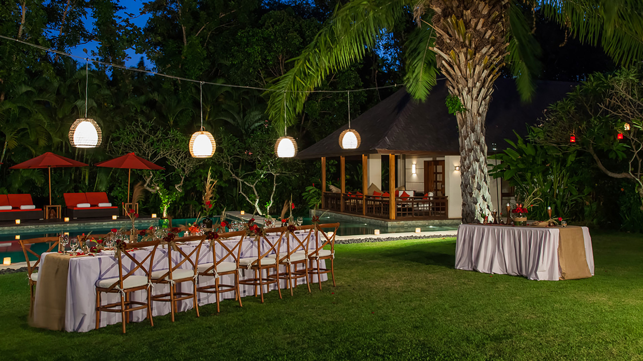 The remaining four bedrooms are in pairs alongside the lawn. Each enjoys its own terrace, and similarly generous dressing areas and bathrooms with sunken baths and outside showers. A large decked living space is shared by each pair – an ideal place to spend a lazy afternoon out of the heat of the Bali sun.