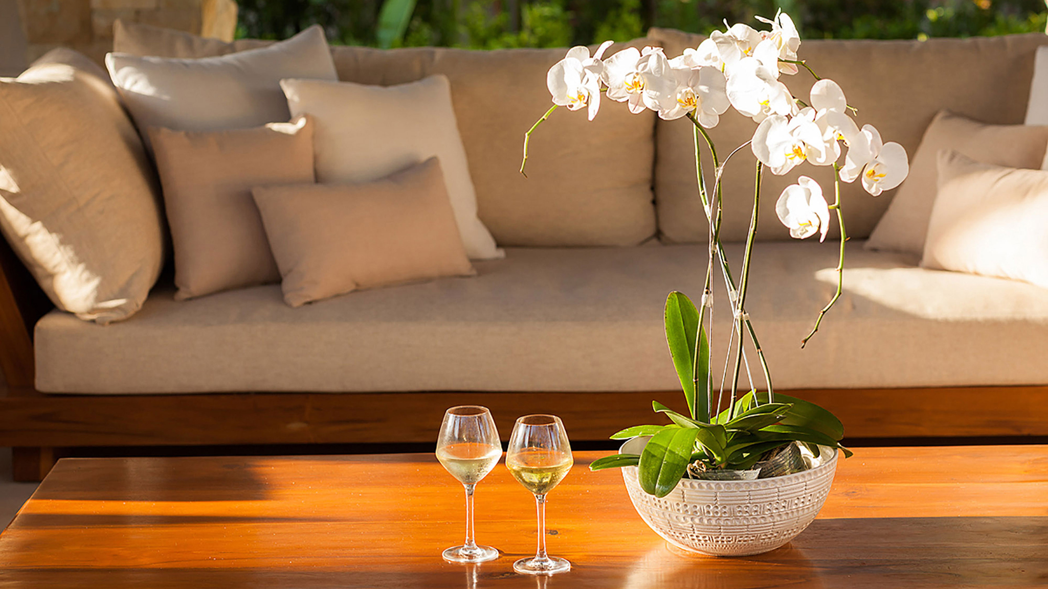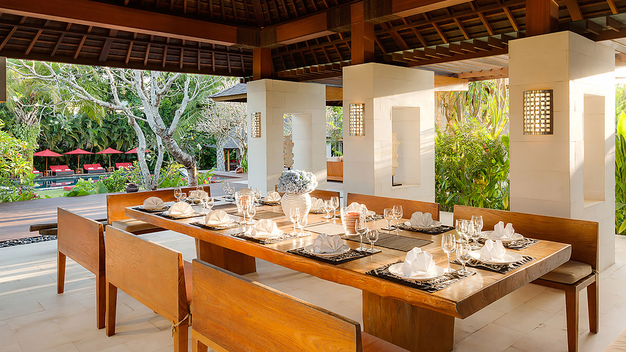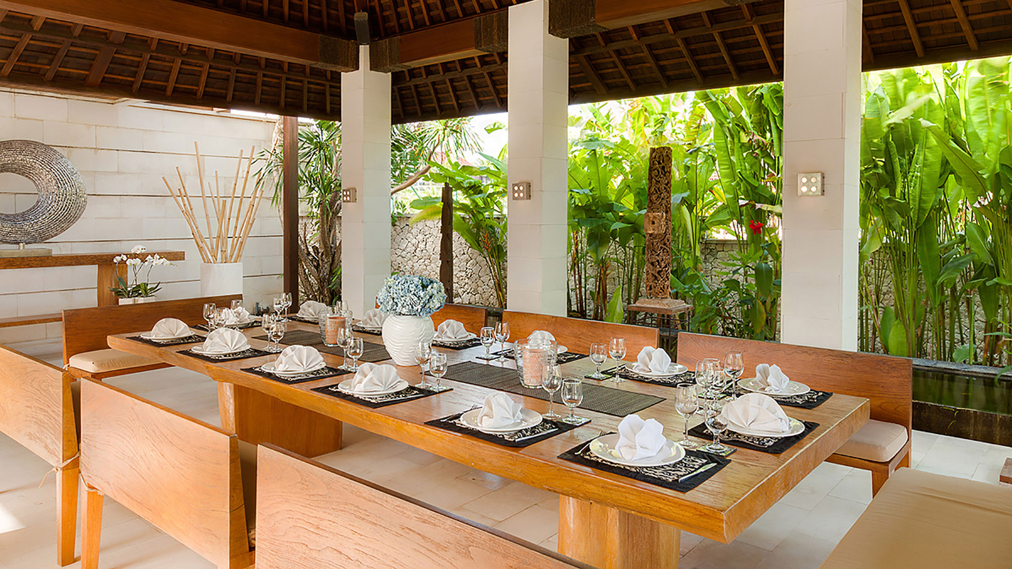 Adjacent to the living room is an open dining area with a four-meter-long table made from a single tree. Benches seat 16. Service is from the modern and extremely well-equipped kitchen, the domain of the in-house chef and his support staff. Drinks are typically served in the open-air sunken lounge bar between the living and dining rooms.
