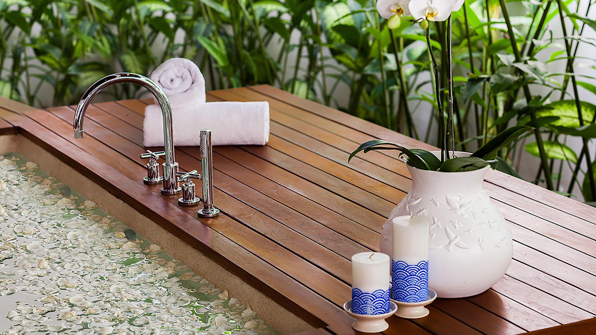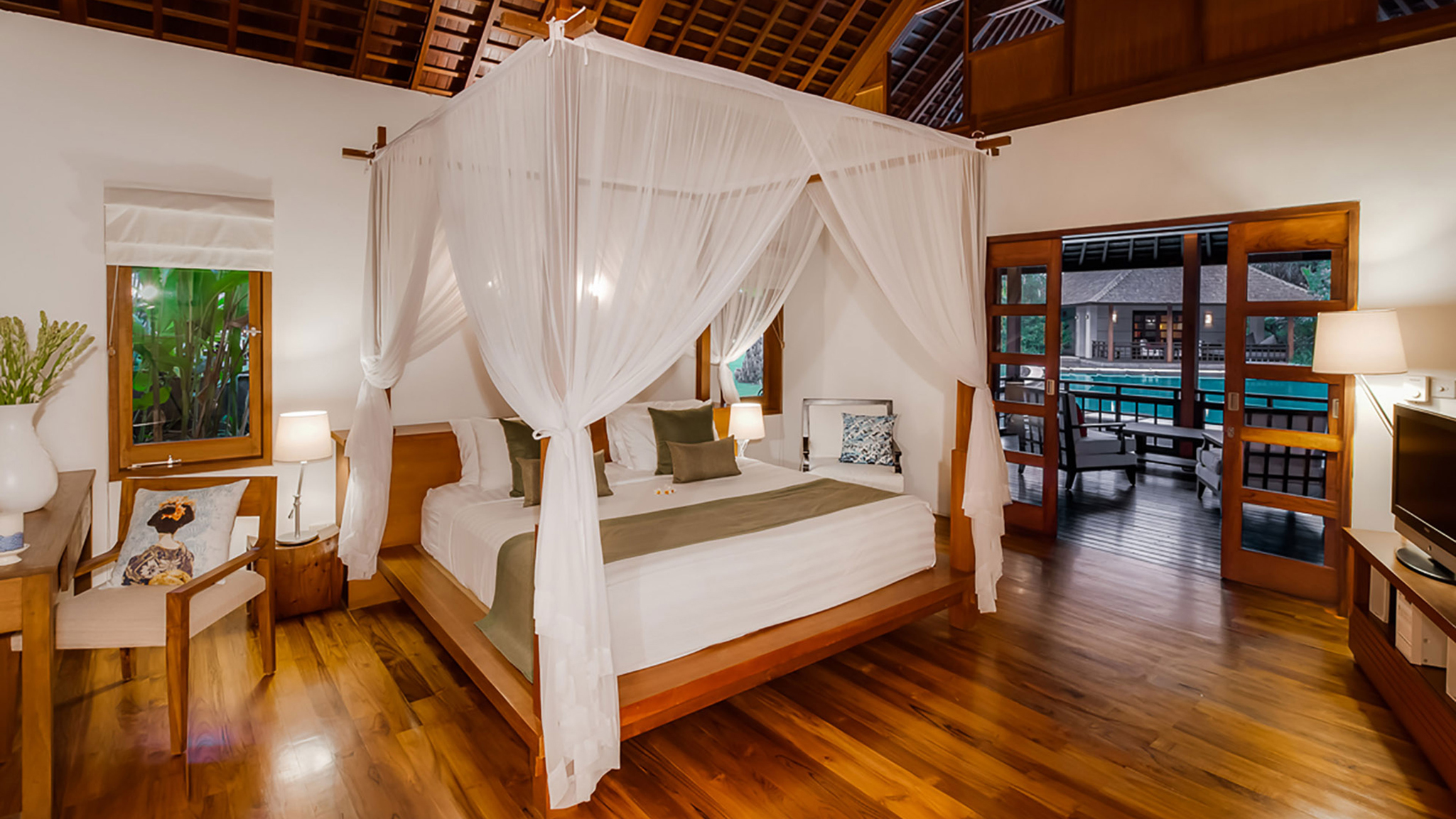 The villa’s six bedroom suites are housed in individual pavilions. Either side of the pool are the two huge master suites. Each has an expansive terrace overlooking the pool with steps leading down into the turquoise waters. King-size four-posters dominate these bedrooms, leading from which are dressing areas and vast semi-open-air bathrooms with teak-decked baths and rain showers.