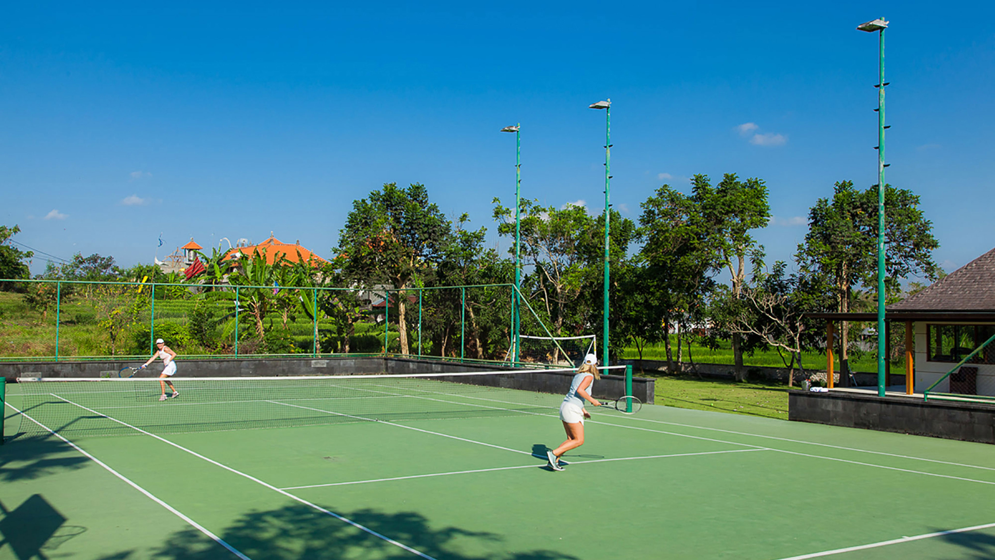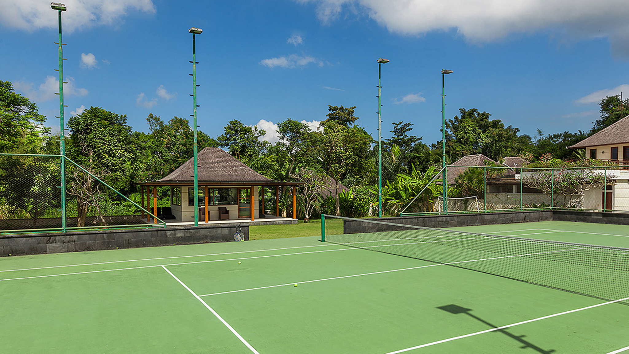 Above the kitchen and staff quarters is a media room with projection TV screen, DVD player and stereo. An outside terrace offers commanding views of the tennis court and surrounding rice terraces.